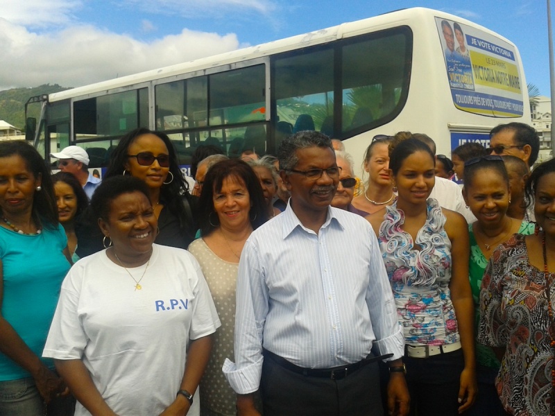 A la veille du début de la campagne officielle, René-Paul Victoria a présenté ce dimanche 9 mars 2014 son dispositif. Le rendez-vous a été pris près du petit marché, "un site emblématique où aurait dû être construit le pôle Océan", tacle l'ancien maire de Saint-Denis. Sur le parking, ont été présentés un bus et trois véhicules aux couleurs de la candidature du duo Victoria-Dindar.