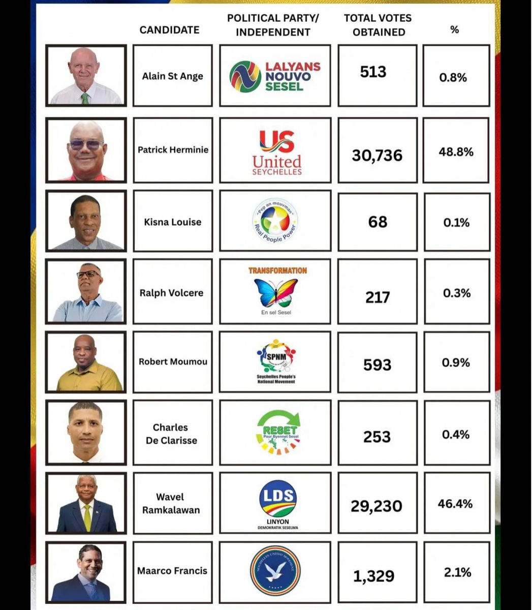 D’après la Commission électorale, le candidat de l’opposition Patrick Herminie est arrivé en tête du premier tour avec un score de 48,8 % des voix, contre 46,4 % pour le président sortant Wavel Ramkalawan.