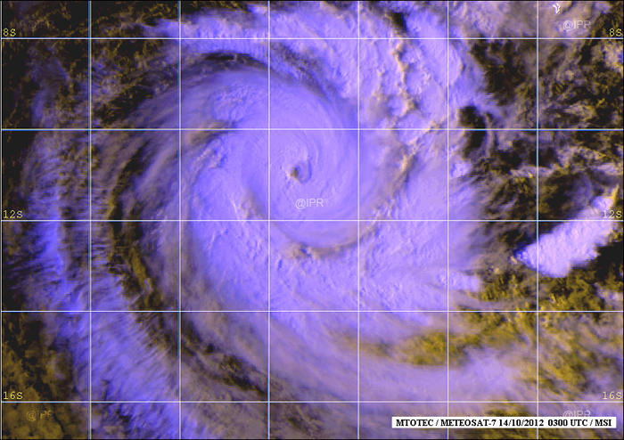 A 16 heures ce dimanche 14 octobre 2012, Anaïs se trouvait à 1 510 km au Nord-Est des côtes réunionnaises par les points 11.4 Sud et 65.8 Est. Le système dépressionnaire s'est encore renforcé pour devenir cyclone tropical intense. Il se déplace vers le Sud-Ouest à la vitesse de 13 km/h. Il ne présente aucun danger pour La Réunion pour les prochaines 72 heures. (image satellite Mtotec)