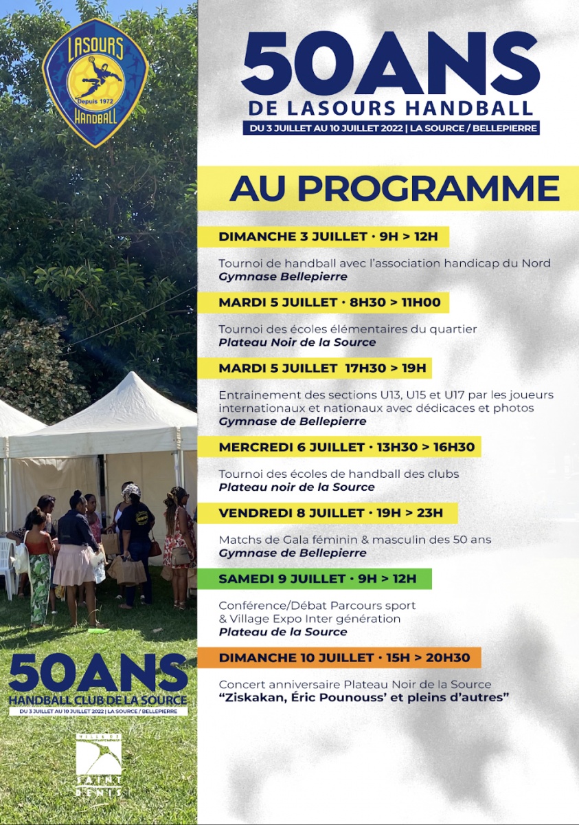 La Ville de Saint-Denis célèbre les 50 ans du Handball Lasours, club emblématique de La Réunion. Pour cet anniversaire, d'anciens joueurs du club à la renommée nationale voire internationale ont fait le déplacement : Nicolas Claire (PAUC), Benoit Kounkoud (PSG), Natan Paquiom (CDF Limoges) et Jeffrey M'tima (Schiltigheim - Alsac. Ces joueurs iront à la rencontre des dionysien.nes lors de plusieurs matchs de gala (Photo rb/www.ipreunion.com)