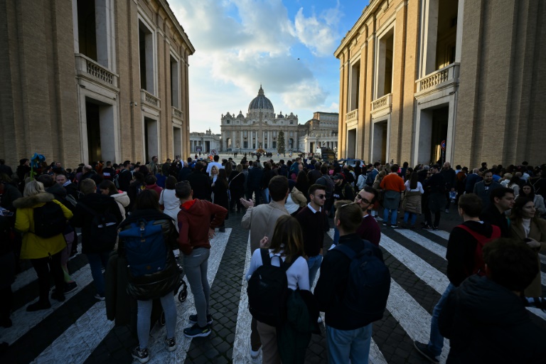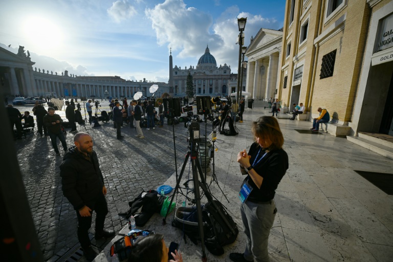 Aux abords de la place, sous un grand ciel bleu, des journalistes du monde entier se sont installés pour les premiers plateaux télévisés au moment où fidèles et touristes apprenaient peu à peu la nouvelle, souvent via une notification reçue sur leur smartphone.