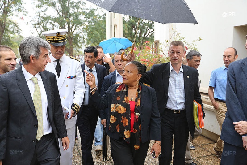 Arrivée sous la pluie, Christiane Taubira a été accueillie par les élus locaux, mais également par un justiciable qui a souhaité lui faire part de ses soucis. "Je suis menacé quotidiennement par un étranger, un kamikaze", a-t-il déclaré à la ministre en tentant de lui remettre un dossier. "Il ne faut pas que je prenne vos pièces monsieur. Donnez-moi plutôt vos coordonées", lui a répondu la garde des Sceaux avant de poursuivre sa visite du tribunal de grande instance de Saint-Denis. Une visite au cours de laquelle elle a pu notamment s'entretenir quelques instants avec le président du conseil régional Didier Robert et la présidente du conseil général Nassimah Dindar.