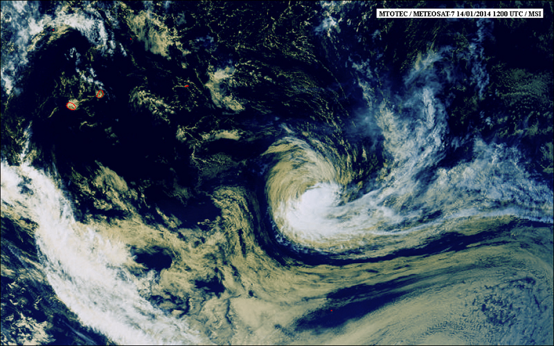À 16 heures ce mardi 14 janvier 2014, le système dépressionnaire Colin a perdu en intensité. Rétrogradé au stade de dépression post-tropicale, il continue de s'éloigner de La Réunion. Colin se situait ainsi à 1 875 kilomètres à l'est-sud-est des côtes réunionnaises par les points 27.7 Sud et 73.0 Est. La dépression post-tropicale se déplace toujours à la vitesse de 15 km/h en direction du sud. Elle ne représente aucune menace cyclonique pour les prochaines 72 heures, selon Météo France. (image satellite www.mtotec.com)