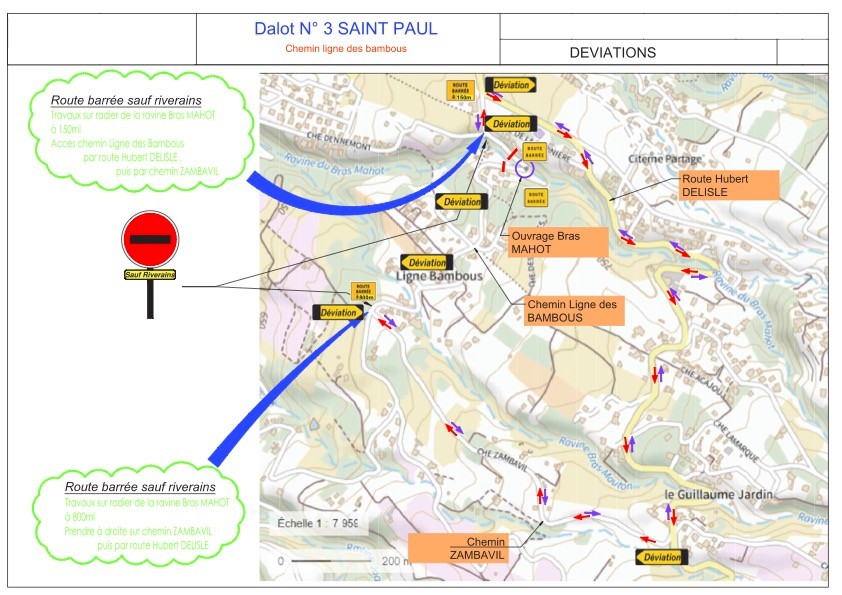 La Ville de Saint-Paul vous informe que le tronçon du chemin Ligne des Bambous au Guillaume, traversé par le radier Bras Mahot, sera temporairement fermé à la circulation automobile du lundi 25 septembre au mardi 3 octobre 2023, sauf pour les piétons.