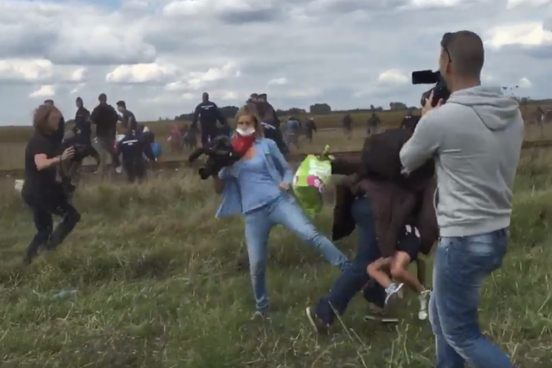 En Hongrie, une journaliste a été filmée ce mardi 8 septembre 2015 en train de faire un croche-pied à un migrant qui tentait de fuir face à la police avec son enfant dans les bras. La femme, qui travaille pour un média local proche de l'extrême droite, a également donné des coups de pied à deux enfants qui s'enfuyaient. La scène a été immortalisée à Röszke, à la frontière serbo-hongroise.