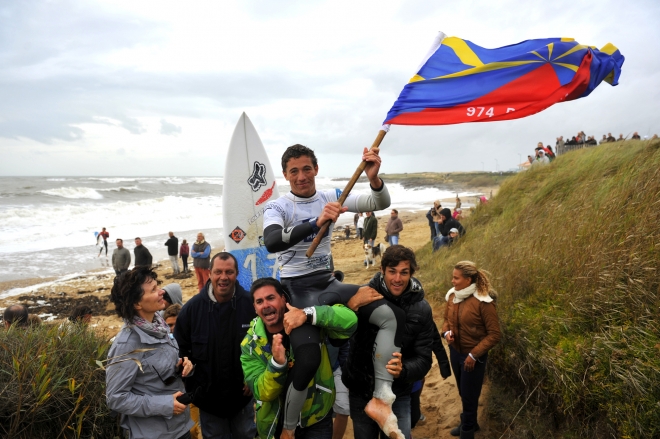 Les Réunionnais Jorgann Couzinet (surf open) et Johanne Defay (surf dames) se sont imposés ce dimanche 20 octobre dans les deux catégories reines des championnats de France de surf, à Brétignolles-sur-Mer, en Vendée. Un doublé que les surfeurs de l'île n'avaient pas réalisé depuis 21 ans. (photo www.surfingfrance.com - Jorgann Couzinet)