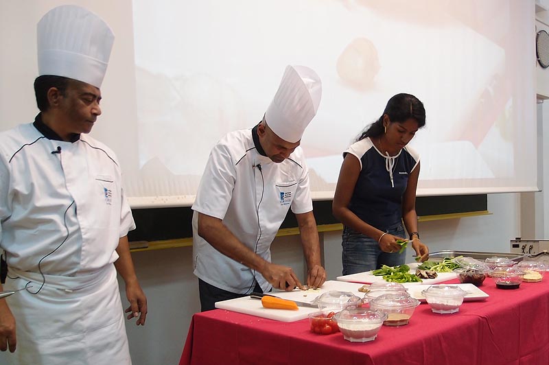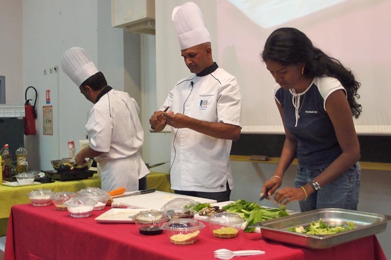 Pour d'autres étudiants, l'expérience est plutôt l'occasion de s'améliorer en cuisine. "C'est une très bonne initiative. On observe, on écoute les conseils des chefs, on voit des techniques de découpage différentes, et on apprend à mélanger les saveurs. Par exemple, en entrée, on nous a proposé une salade fraîcheur composée de fruits et de légumes : poivron, ananas, concombre, clémentine, tomate, carotte. La vinaigrette était parfumée au fruit de la passion. C'est très enrichissant, c'est joli à regarder et c'est bon. Ça donne des idées pour cuisiner chez soi, ça change du traditionnel riz/grains/carri que j'ai l'habitude de préparer", déclare Annabelle, étudiante en lettres.