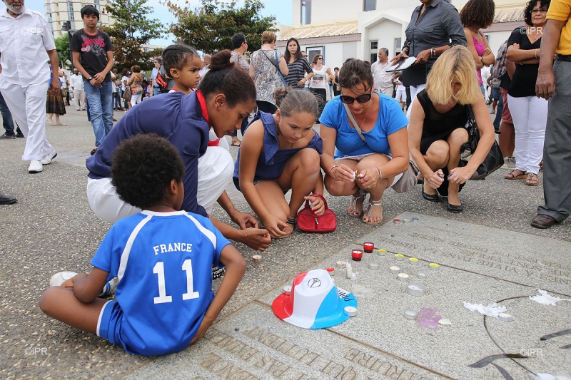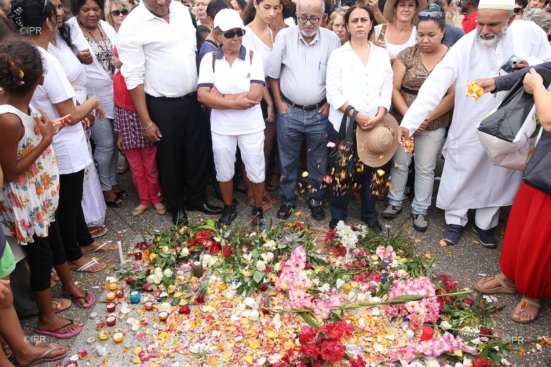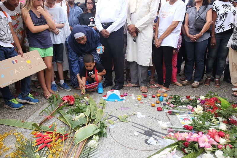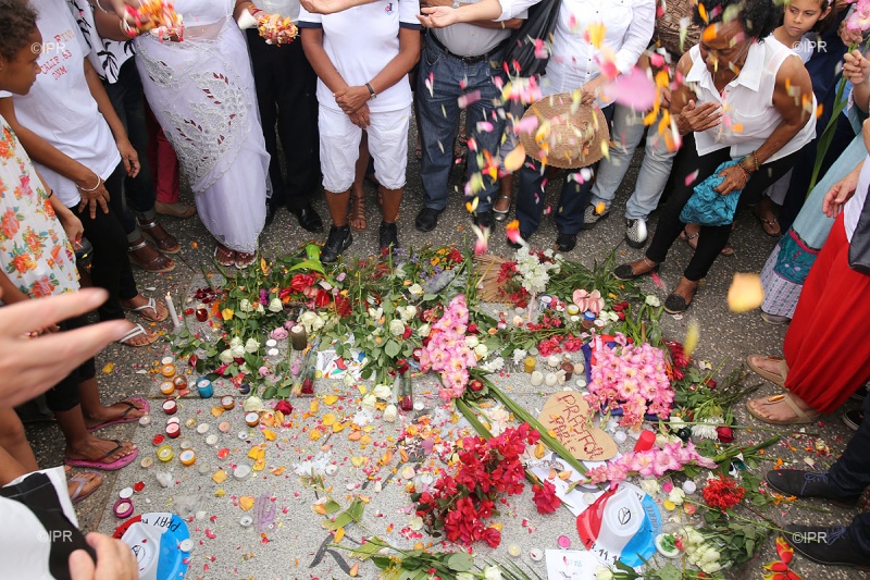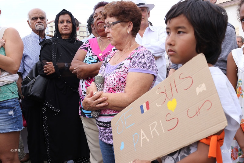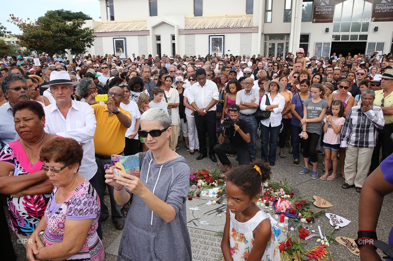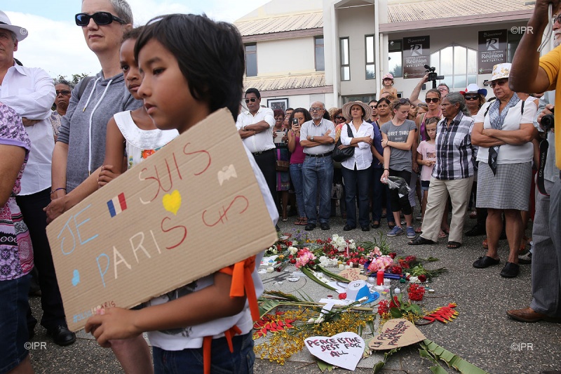 L'appel au rassemblement de la Ligue des droits de l'homme réunit ce dimanche 15 novembre 2015 un millier personnes sur le parvis des Droits de l'homme à Champ Fleuri (Saint-Denis). L'heure est au recueillement et au dépôt de fleurs et de bougies. Des gens de toutes confessions se sont réunis pour rendre hommages aux victimes décédées sous les balles de terroristes alors qu'ils étaient en train d'écouter un concert ou de prendre un verre en terrasse dans les rues parisiennes. La Réunion se recueille, 48 heures après les attaques qui ont fait saigner Paris le vendredi 13 novembre 2015.