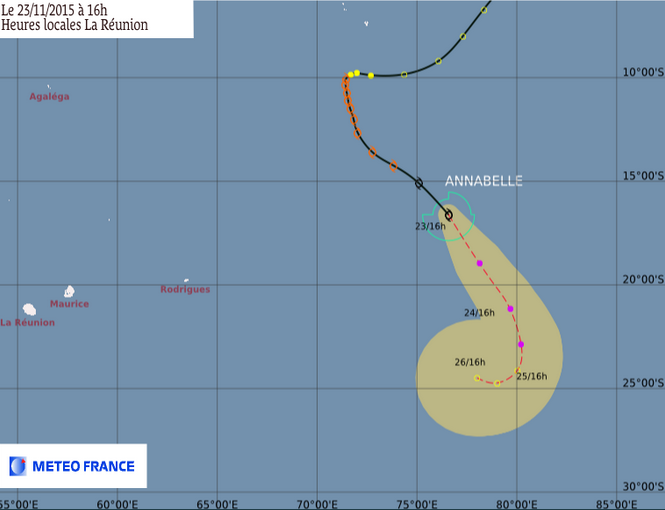La tempête tropicale modérée, s'est formée à l'est de Diego-Garcia. Après avoir suivi une trajectoire Ouest-Sud-Ouest, Annabelle s'est dirigée plus au Sud. Actuellement, elle emprunte la direction du Sud-Est avec une vitesse de 33km/h et semble s'éloigner de La Réunion.