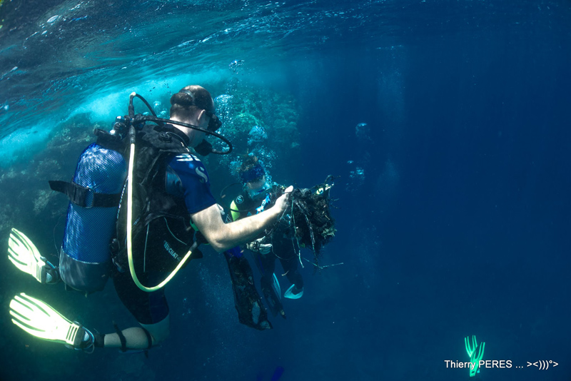Des centaines de mètre de fils de pêche ont ainsi été retirés méticuleusement du corail. Des plombs de pêche, des plastiques – sac, sachets etc -, et de piles notamment ont aussi été récupérés