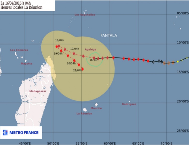 Fantala, devenu cyclone tropical intense continue pour l'instant sa route loin des côtes réunionnaises. Ce samedi 16 avril 2016, à 16 heures, il se trouvait à 985 km au Nord de La Réunion contre 960 km ce matin. Le système a cependant gagné en vitesse, il se déplace désormais vers l'ouest à une vitesse de 19 km/h. Si sa trajectoire pourrait prochainement opérer un demi-tour, aucune menace n'est prévue pour les prochaines 72 heures.