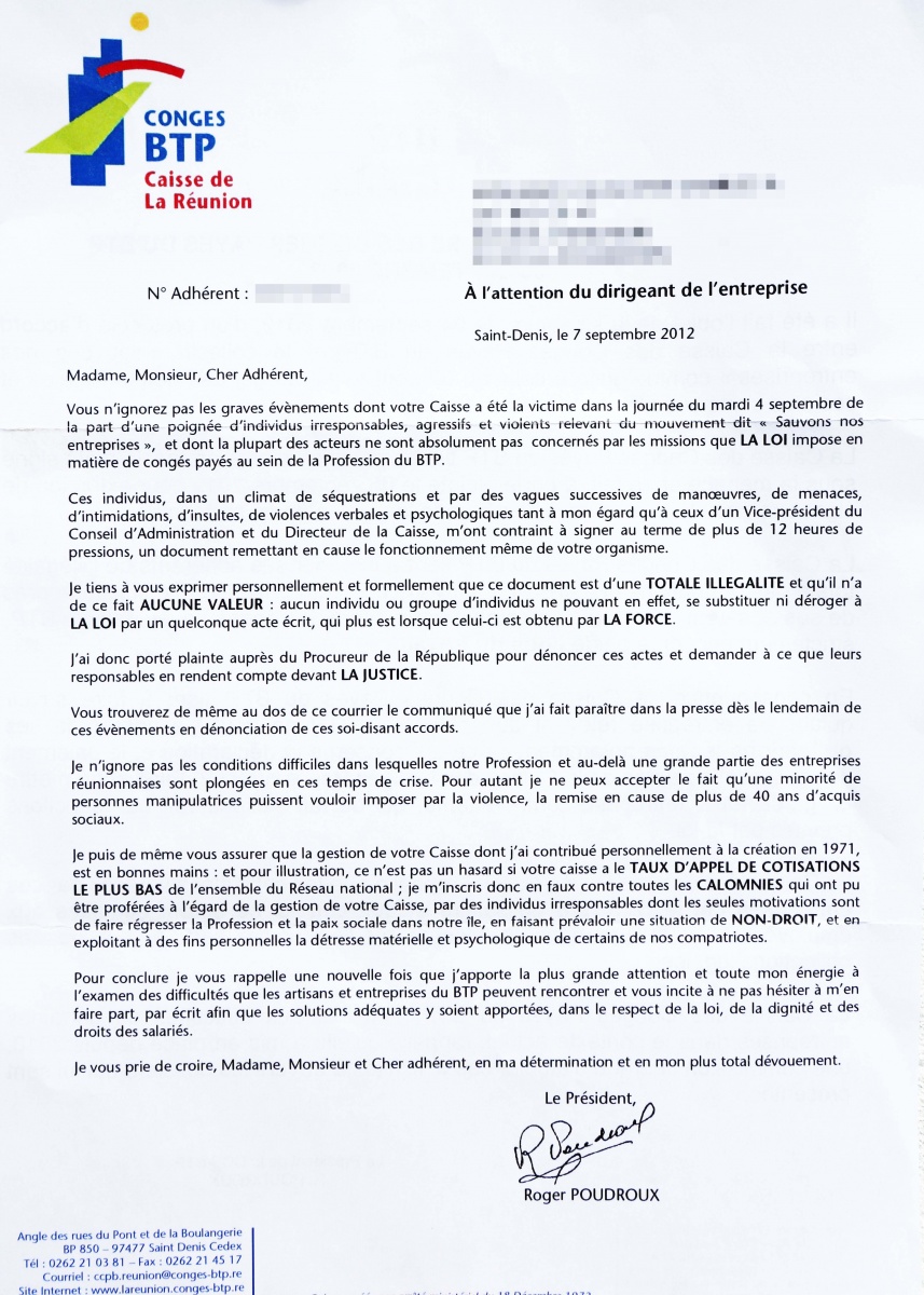 Depuis quelques jours, des milliers de courriers sont envoyés aux entreprises ressortissantes de la caisse des congés payés du bâtiment et travaux publics (BTP). Ce courrier est signé par Roger Poudroux, président de la structure et il vient à la suite du protocole d'accord signé le mardi 4 septembre 2012 avec le collectif "Sauvons nos entreprises". Roger Poudroux affirme dans sa lettre que cet accord est d'une "totale illégalité" et qu'il n'a de ce fait "aucune valeur". Sans l'écrire clairement, le président note ainsi que les mesures sur le versement direct aux salariés des congés payés par les entreprises et surtout sur le gel des dettes des sociétés jusqu'au 30 juin 2013 pour cause de cotisations impayées sont nulles et non avenues