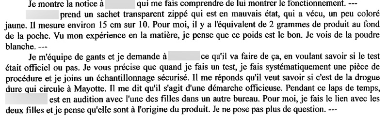 Les déclarations contenues dans les procès-verbaux d'audition dans le dossier d'instruction qu'ipreunion.com a consulté, sont pour étonnantes. "Oui j'ai eu la drogue en main, oui je l'ai laissé sur mon bureau, oui j'ai demandé à un camarade de la redonner à mon informateur" reconnaît le gendarme principalement mis en cause avec une naïveté et une candeur insoupçonnées à son niveau de fonction et de grade. "Je n'aurais pas dû faire comme ça" accepte-t-il toutefois d'avouer...