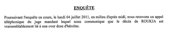 Si l'enquête sur la mort de Roukia s'était d'abord orientée vers la thèse du meurtre, il apparaîtra finalement après autopsie que le décès de la jeune femme est "vraisemblablement lié à une overdose d'héroïne", peut-on lire dans le procès-verbal d'investigations de l'inspection générale de la gendarmerie nationale, qu'Imaz Press Réunion s'est procuré (extrait ci-dessous du procès verbal d'audition) :