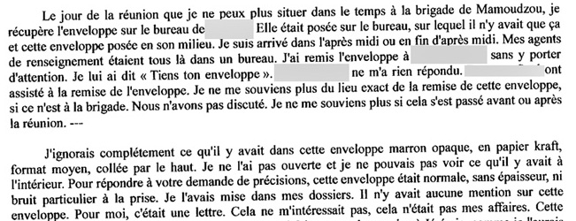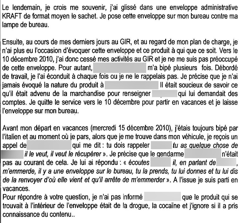 Le second gendarme, celui qui a redonné la drogue au "tonton", reconnaît son geste mais jure qu'il "ignorait complètement ce qu’il y avait dans cette enveloppe marron opaque". "Mon camarade m'a dit ‘il (l'informateur – ndlr) m'emmerde’. Prends l'enveloppe sur mon bureau, donne-lui et dis-lui qu'il arrête de m'emmerder. C'est ce que j'ai fais sans me poser de question", raconte ce gendarme doté d'un étonnant manque de curiosité (extrait ci-dessous du procès verbal d'audition)