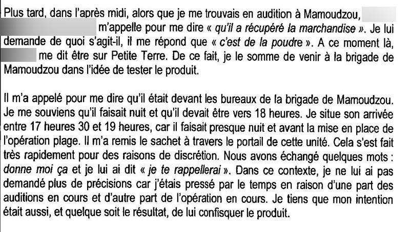 Une dizaine de jours plus tard, à la demande instante du "tonton" qui veut récupérer la marchandise, le gendarme détenteur demande à l'un de ses collègues de donner la drogue en question à l’indic en question, en présence d'un autre "tonton", toujours sans qu'aucun acte de procédure judiciaire ne soit établi et sans même en avertir le parquet (extrait ci-dessous du procès verbal d'audition)