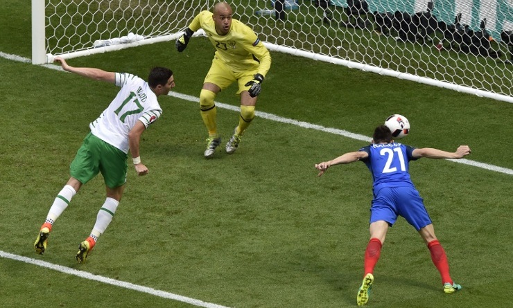 #Euro2016 Lloris trompé par Brady sur penalty (poteau rentrant). L'Irlande mène 1 à 0 face aux Bleus #AFP #FRAIRL pic.twitter.com/NOjJwGEp4e