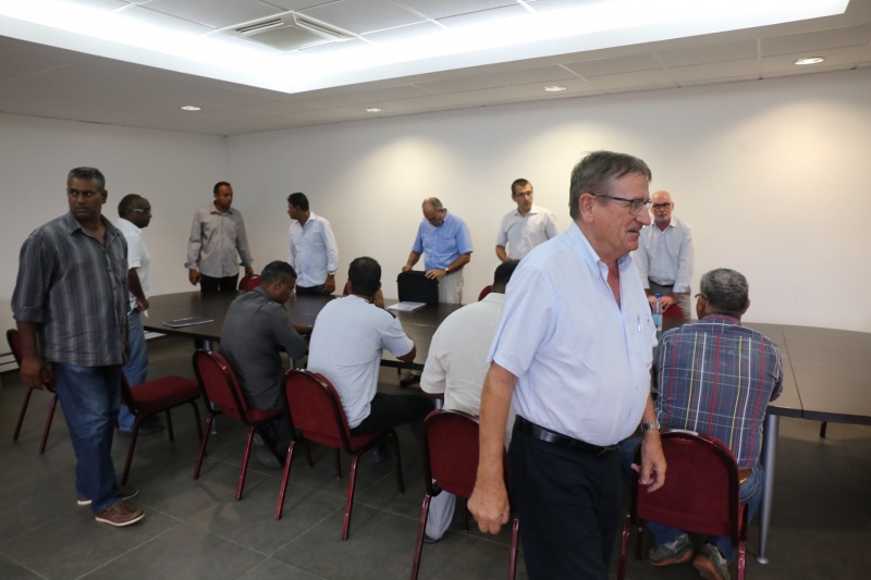 17h20 : La réunion a commencé en présence de Dominique Fournel, Stéphane Brabant, Alain Gagey, Boris Duverger, le président de la GTOI (Grands travaux de l'Océan Indien), Nicolas Morbé, administratif de la Région, et les transporteurs.