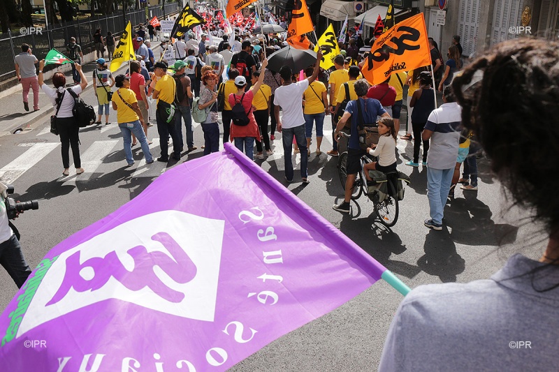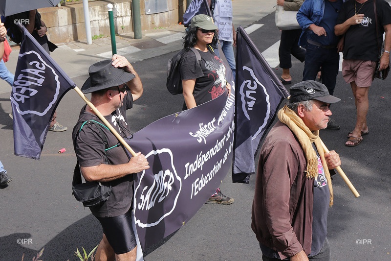 11h30 : Le cortège, maintenant près de la mairie, entame sa dernière ligne droite vers la préfecture. Saiper, Fsu, Cgtr, Solidaire, Unef, Fo : les manifestants affichent drapeaux et tee-shirts aux couleurs de leurs syndicats.