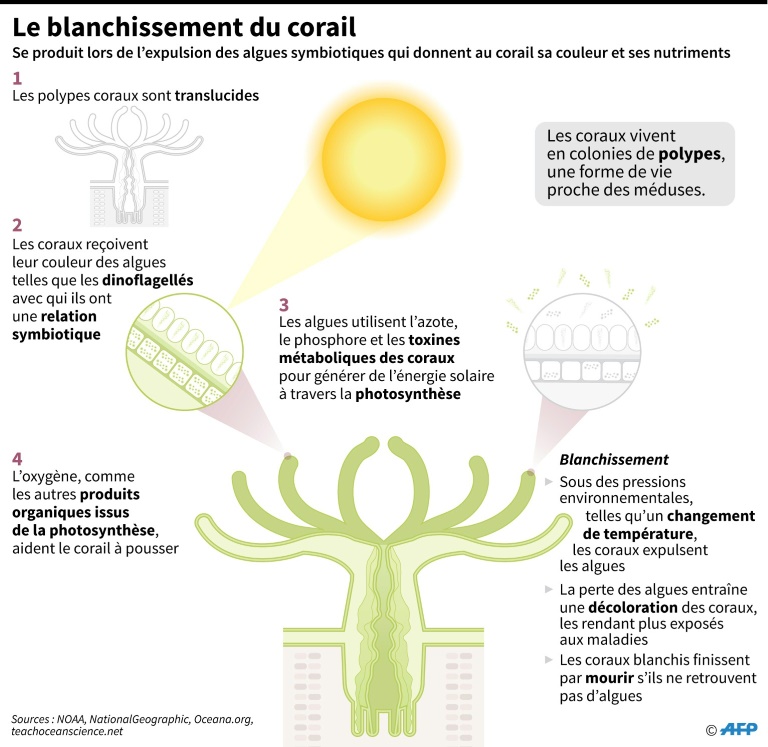 Le blanchissement des coraux est un phénomène de dépérissement qui se traduit par une décoloration. Il est provoqué par la hausse de la température de l'eau, qui entraîne l'expulsion des algues symbiotiques qui donnent au corail sa couleur et ses nutriments.