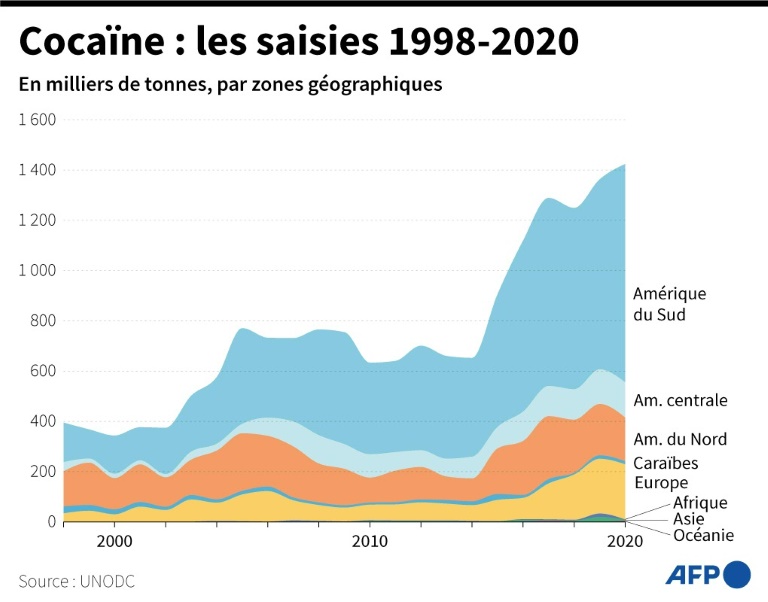 Les experts estiment à plus de 2.000 tonnes le volume total de cocaïne proposé sur le marché mondial en 2021.