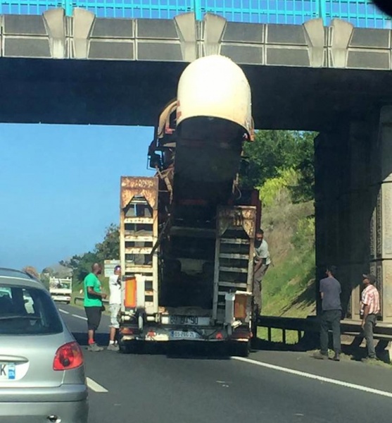 A Sainte-Marie, des bouchons se sont formés sur la quatre voies en direction de Saint-André ce lundi 12 octobre 2015. La cause de cet embouteillage ? Un poids-lourd qui est resté bloqué sous le pont situé à la sortie du centre-ville. Une raison insolite qui a beaucoup amusé les internautes, mais agacé les automobilistes bloqués dans la circulation. (photo Vincent DamOurr / Radar 974)