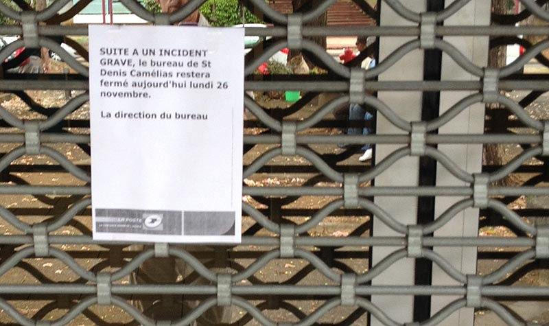 "Les clients sont invités à effectuer leurs opérations dans un autre bureau. Le distributeur de billets externe fonctionne normalement", indique la Poste.
