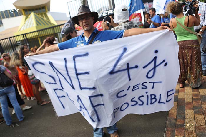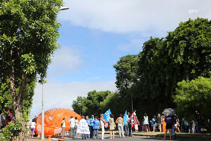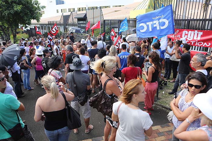 Une délégation de manifestants devrait être reçue au rectorat vers 17 heures ce mercredi 3 avril 2013. Pour rappel, à l'appel de l'intersyndicale de l'éducation (CGTR Educ'action, Saiper-Pas 974, FNCE-FP-FO, Sud Education, SNE, Scenrac-CFTC), une cinquantaine de personnes manifeste depuis 14h30 devant les grilles du rectorat. Ils protestent contre la réforme des rythmes scolaires et soutiennent notamment les directeurs d'école et le personnel enseignant de la circonscription Saint-Denis 2, où le retour à la semaine de 4,5 jours se fera dès la rentrée 2013. Demandant à être reçus par le recteur Thierry Terret, les manifestants ont bloqué la route devant le rectorat pour faire entendre leurs revendications.