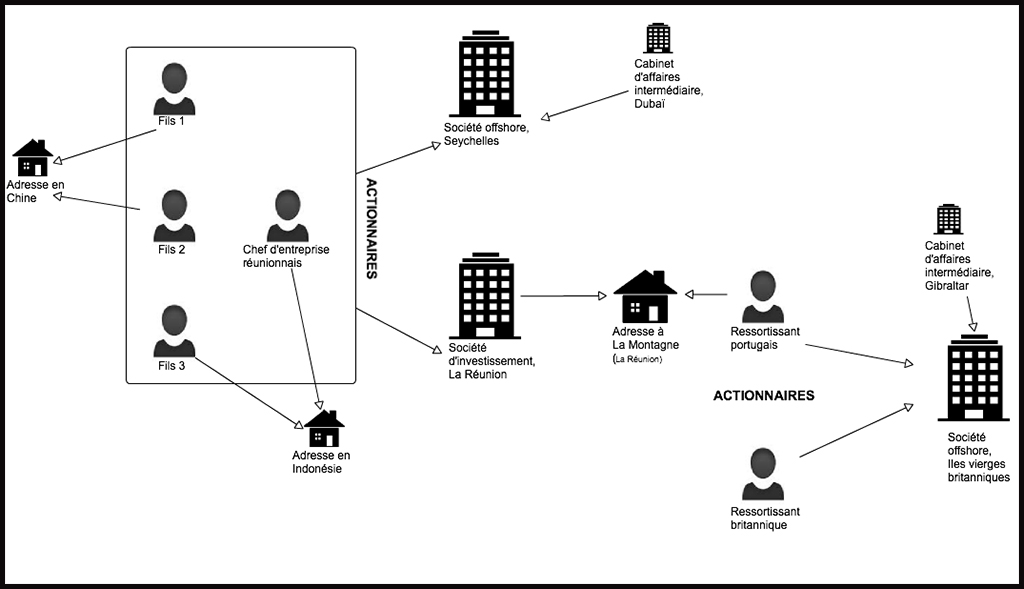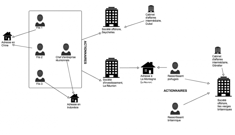 Premier protagoniste, un chef d'entreprise réunionnais, qui apparaît comme actionnaire d'une société offshore, enregistrée aux Seychelles. Trois autres actionnaires figurent dans les documents publiés sur cette entreprise, ces derniers se révèlent être ses trois fils. Mais, tous les quatre ne sont pas domiciliés à La Réunion : le père et le plus jeune fils ont une adresse en Indonésie et les deux premiers garçons sont associés à une adresse en Chine. Pourtant, nos recherches ont établi que le père, l'ainé et le plus jeune de ses fils vivraient à La Montagne, alors que le cadet vivrait en Métropole. Leur société seychelloise est liée à un cabinet d'affaires situé à Dubaï et dont le nom apparaît près de 900 fois dans les fichiers recueillis par le Consortium.