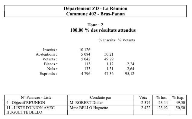 Huguette Bello réalise 50,50% des suffrages dans la commune de Bras-Panon, ville dans laquelle son colisiter le député LFI Jean-Hugues Ratenon l'a largement soutenue. C'est une courte avance cependant, et Didier Robert réalise 49,50% des voix. Sur cette commune, 47,36% des électeurs se sont exprimés. (Photo d'illustration rb/www.ipreunion.com)