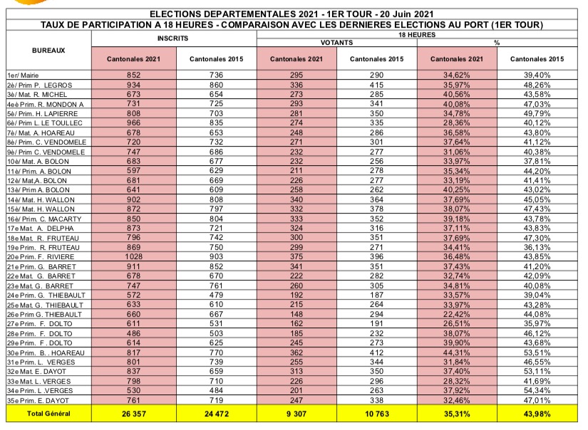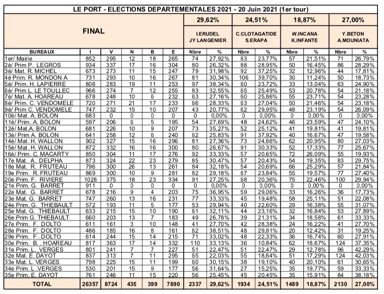 - Canton 16 : sur 22 bureaux sur 27, le binôme Clain et Payet est d’ores et déjà à 51,3%, loin devant le binôme Valy-Techer 27,7% et le binôme Dorilas 20,9%.