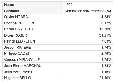 • 41 pour Didiert Robert, 23 pour Ericka Bareigts et 12 pour Huguette Bello