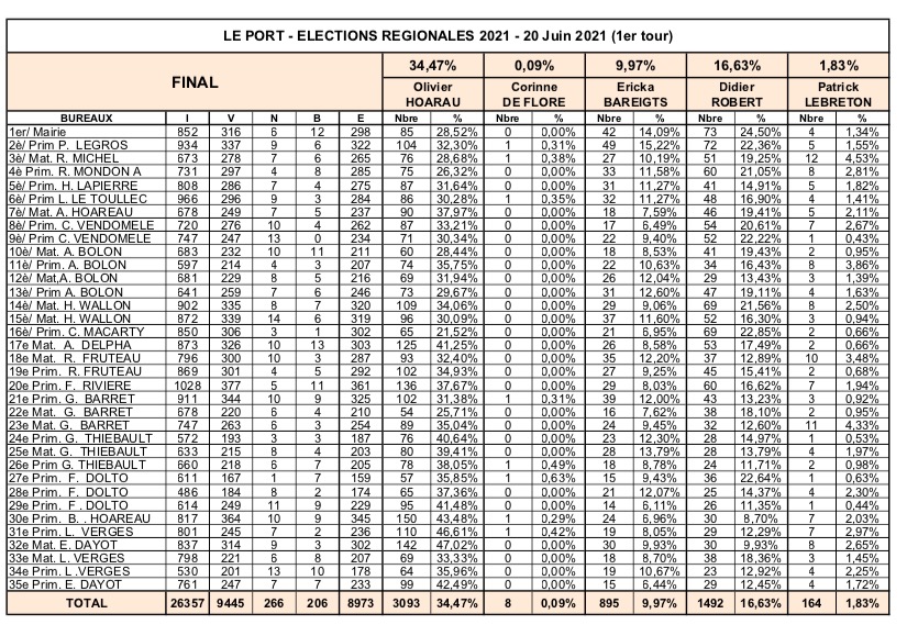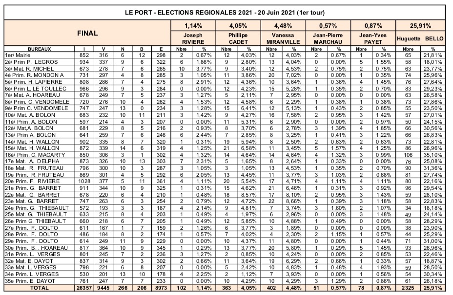 • Au Port : sur le total des bulletins dépouillés, Olivier Hoarau enregistre 28%, Didier Robert 24% et Huguette Bello 21%