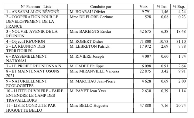 Notre pensée et nos remerciements vont en premier lieu vers les électeurs qui nous ont accordé leur confiance. Qu’ils sachent que nous ferons le maximum pour honorer cette confiance et que nous travaillerons pour toute la population réunionnaise avec sérieux et constance si nous sommes élus à l’occasion de ce second tour. Notre reconnaissance s’adresse ensuite aux militants qui nous ont accompagné et soutenu tout au long de la campagne et dont l’aide a été précieuse.
