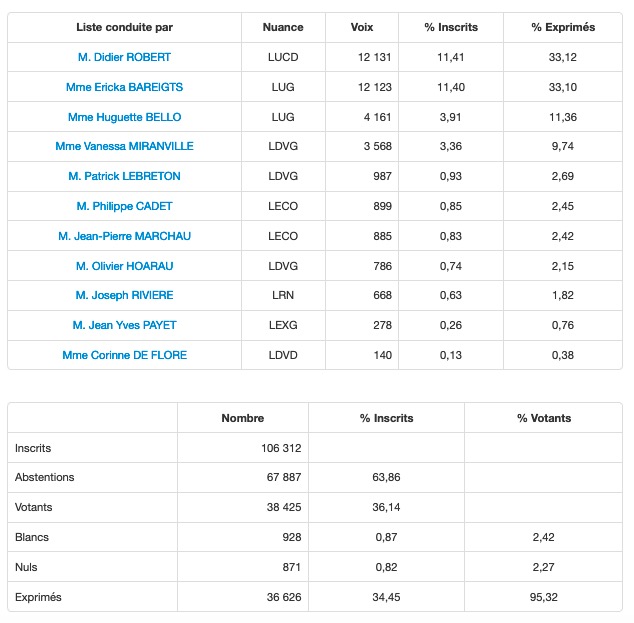 Camouflet pour Ericka Bareigts : la maire de Saint-Denis n'arrive qu'en seconde position dans le chef-lieu. Le président sortant, en tête, la devance en effet...de huit voix. Un score extrêmement serré, qui explique probablement l'annonce très tardive des résultats pour la commune. Au total, Didier Robert comptabilise 33,12% des voix, contre 33,10% pour Ericka Bareigts. Huguette Bello les suit loin derrière, avec 11,36%. Tous les autres candidats se situent en-dessous des 10% (Photo d'illustration rb/www.ipreunion.com)