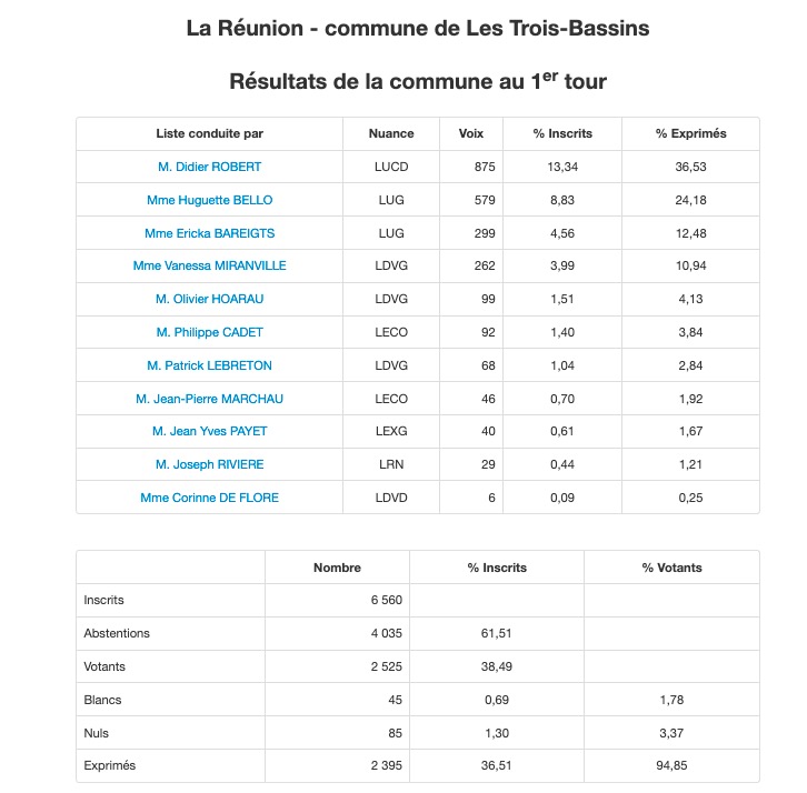 Le président sortant arrive en tête avec 36,53% des voix, suivi par Huguette Bello à 24,18% et par Ericka Bareigts à 12,48%. Le taux de participation s'élève à 36,51%. (Photo photo RB imazpress )