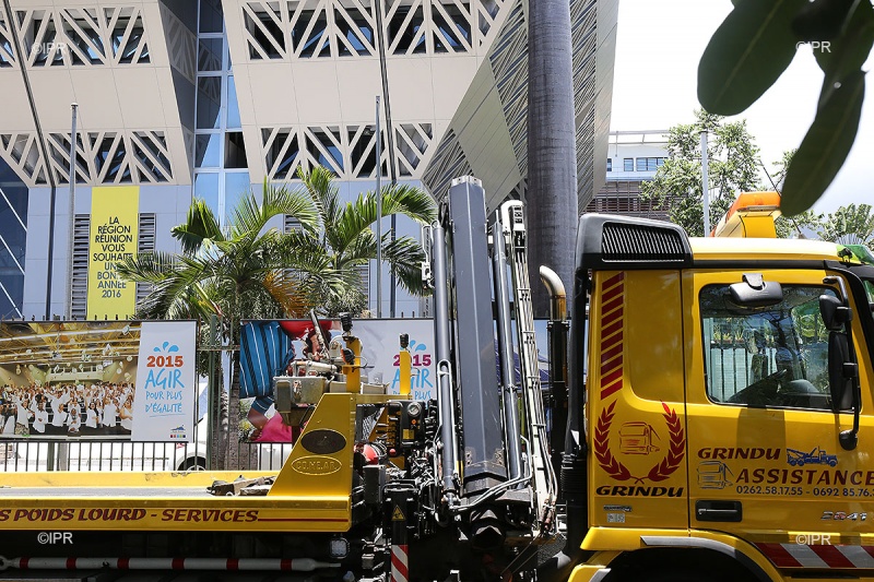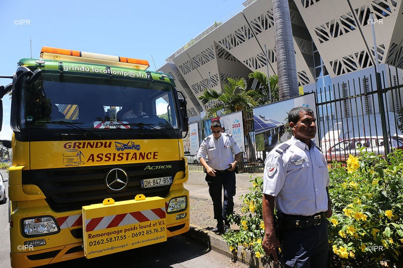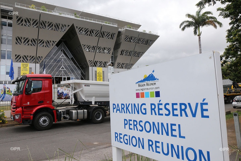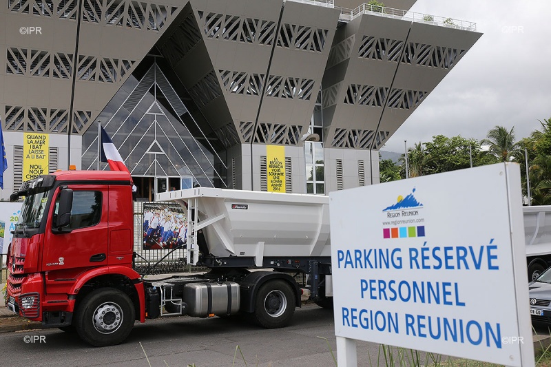 15h35 : Une partie des camions s'est garée devant le Conseil régional, avenue René Cassin, afin de dégager le carrefour entre l'avenue René Cassin et l'avenue Georges Brassens. Les transporteurs indiquent que Stéphane Brabant, directeur du groupement attributaire du marché de la Nouvelle route du Littoral, n'a pas donné suite à leur demande de rencontre à la Région.