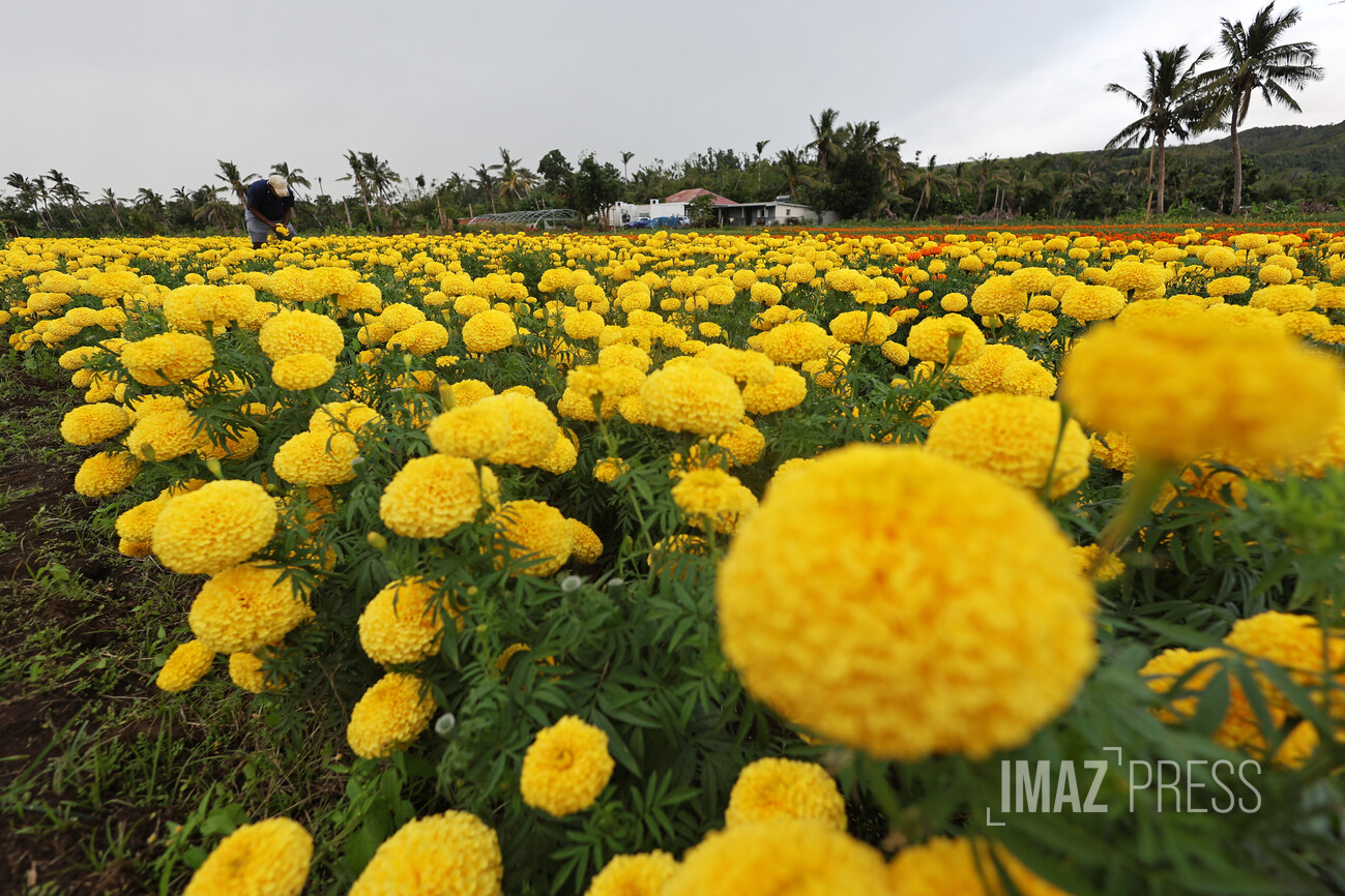 Dans le champ de Jérôme Sornom, les roses d'Inde se comptent par milliers et sont de différentes couleurs aussi éclatantes les unes que les autres : oranges, blanches, jaunes. Ils cultivent ses fleurs depuis 25 ans.
