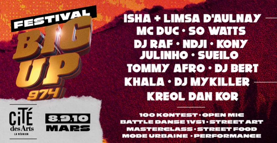 Lancé en 2011 par Kréolide, le festival Big Up 974 a pour objectif "de diversifier l’offre culturelle et sportive à La Réunion tout en favorisant l’insertion et la cohésion sociale. À l’exception du concert du samedi soir, le festival est gratuit afin de permettre à tous de venir et vivre leur passion, ou en découvrir une nouvelle".