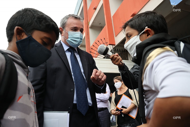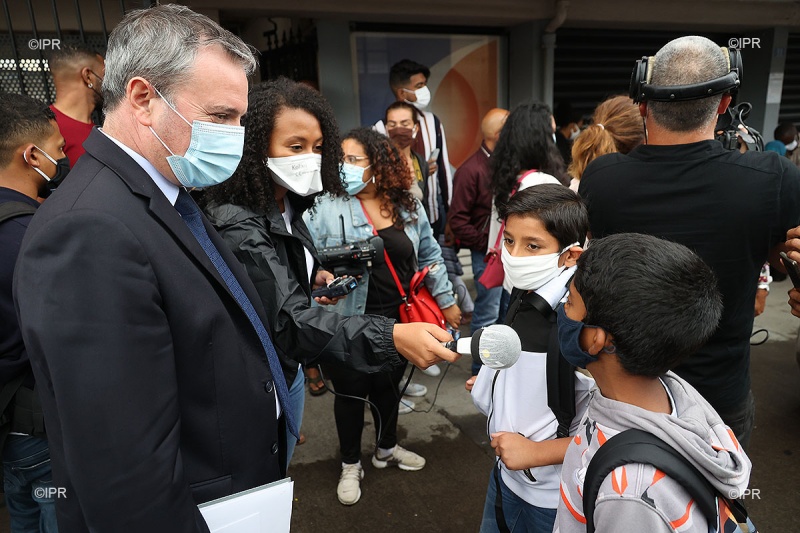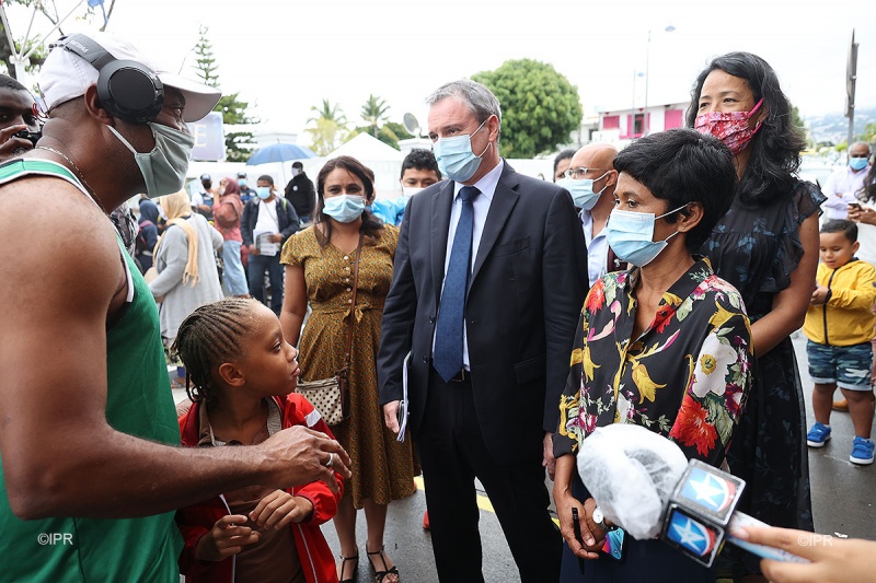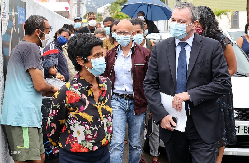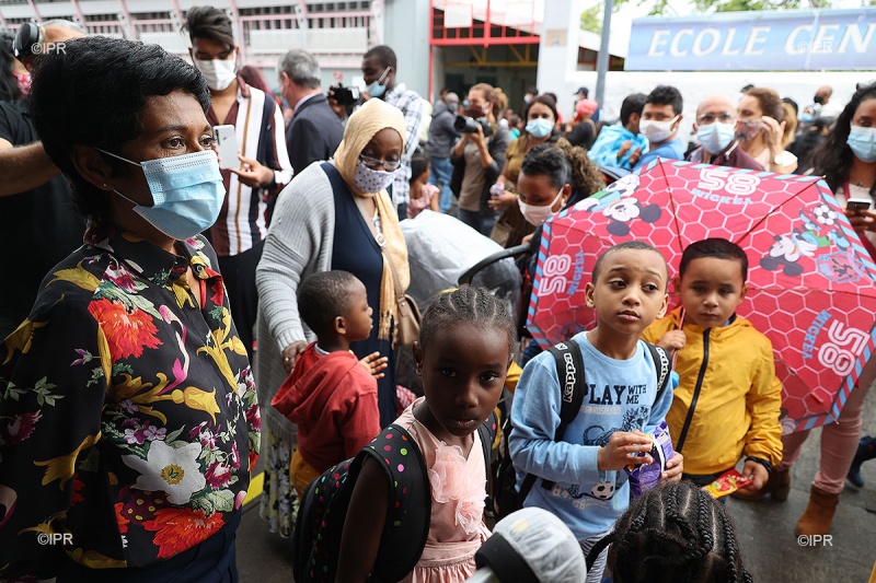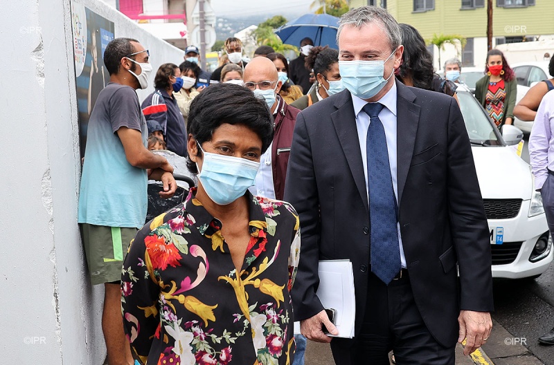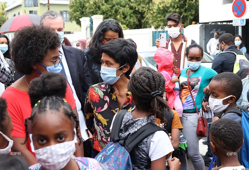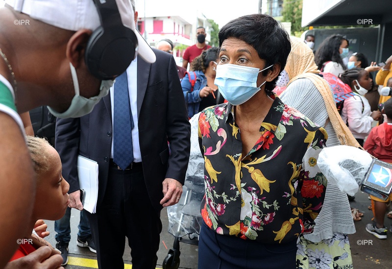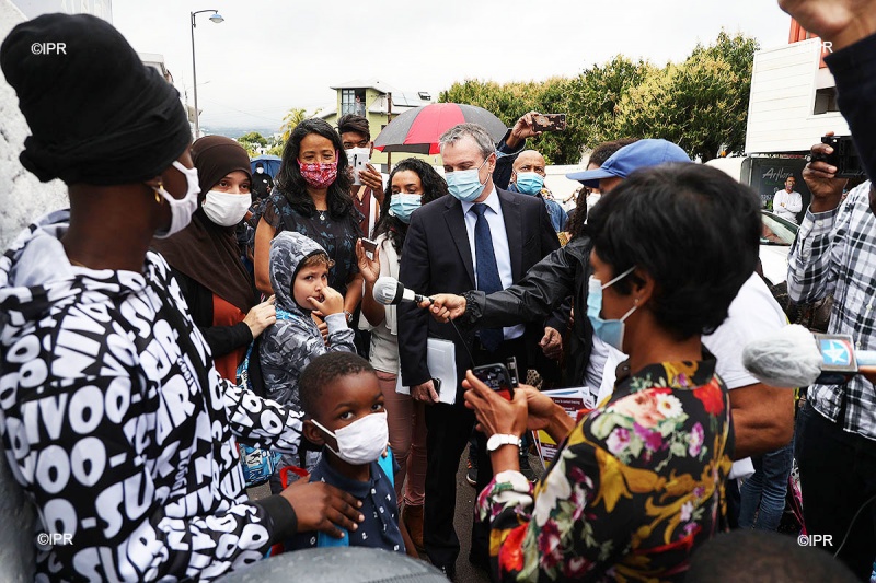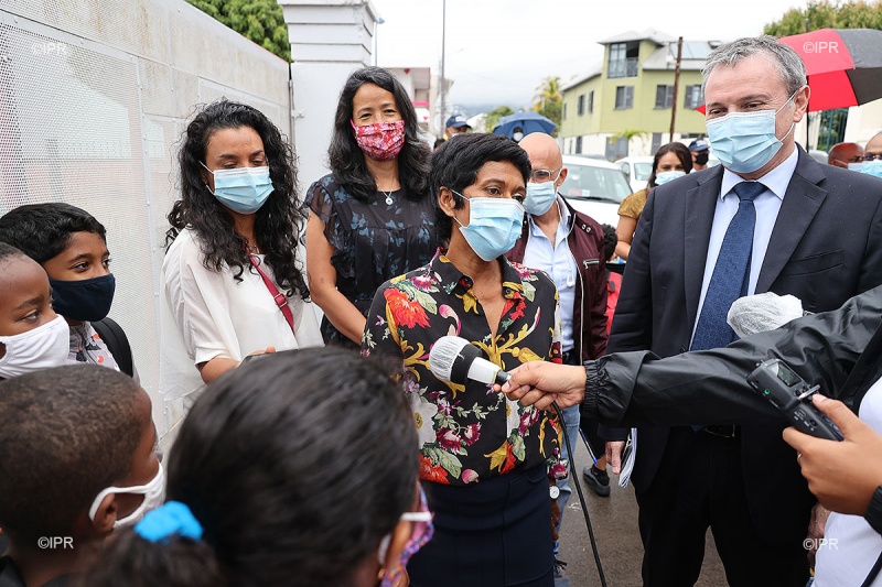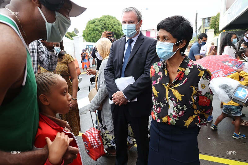 Le préfet de La Réunion Jacques Billant et la maire de Saint-Denis Ericka Bareigts rencontrent, ce lundi 7 septembre 2020, des parents d'élèves dionysiens, à la sortie des classes. L'objectif est de les sensibiliser aux questions sanitaires et recueillir leurs sentiments sur la reprise de l'activité scolaire. Jacques Billant et Ericka Bareigts vont ensuite déambuler dans les rues de la ville, toujours pour sensibiliser la population aux gestes barrière. Préalablement à cette action, le préfet et la maire de Saint-Denis se sont réunis pour évoquer le travail de cartographie Covid de la commune, que les autorités souhaiteraient étendre à l'ensemble de l'île. En marge de cette visite, Ericka Bareigts interrogée par Imaz Press à propos du Grand raid, a indiqué "la décision de maintenir ou pas (la course - ndlr) doit être prise collectivement en tenant compte de la situation sanitaire et pas uniquement sur des considérations sportives ou économiques" (Photo rb/www.ipreunion.com)