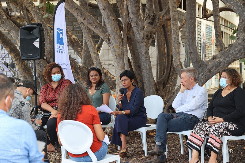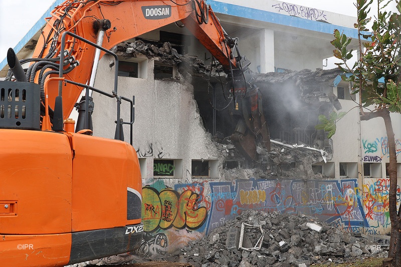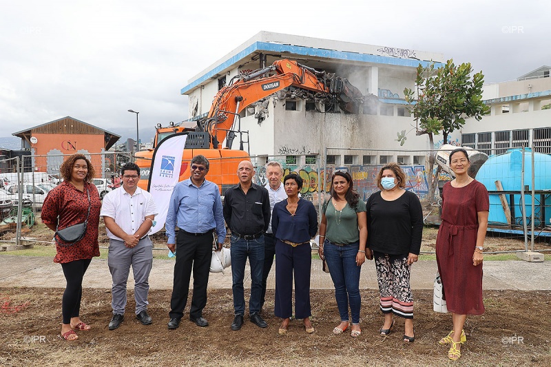 Sont présents Ericka Bareigts, maire de la ville de Saint-Denis, Jacques Lowinski, adjoint délégué à l'aménagement et à l'urbanisme, Jean-Yves Euphrosine, directeur superstructures et bâti, Claudine Pounoussamy, directrice générale adjointe ville durable, Patrick Sambassouredy, directeur général adjoint hyperproximité et services techniques. Ils assistent en direct au premier coup de grue de la démolition de l'ancienne bibliothèque nationale.