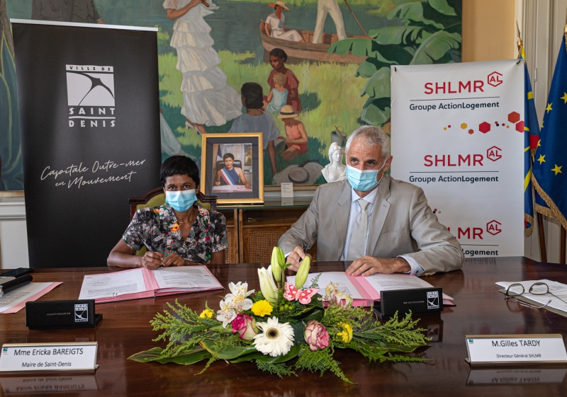 La ville de Saint-Denis et la Société d'habitation à loyer modéré de La Réunion (SHLMR) ont signé ce mardi 23 février un accord pour la réhabilitation et la rénovation de près de 1.200 logements dans les quartiers des Calebassiers et du Ruisseau à Saint-Denis. 34.000m2 d'espaces extérieurs dont 11.000m2 d'espaces verts seront aménagés. Au total, près de 3.600 personnes seront touchées par ces travaux. La mise en application de ce protocole d'accord débutera dès cette année et s'étalera sur trois ans. La mairie et la SHLMR sont actuellement en discussion avec l'organisme Action Logement pour la prise en charge d'une partie des travaux. (Crédit Photo : Mairie de Saint-Denis)