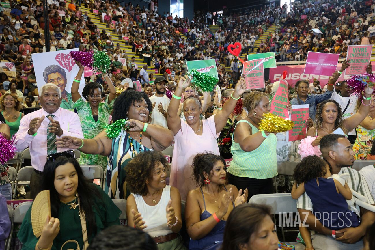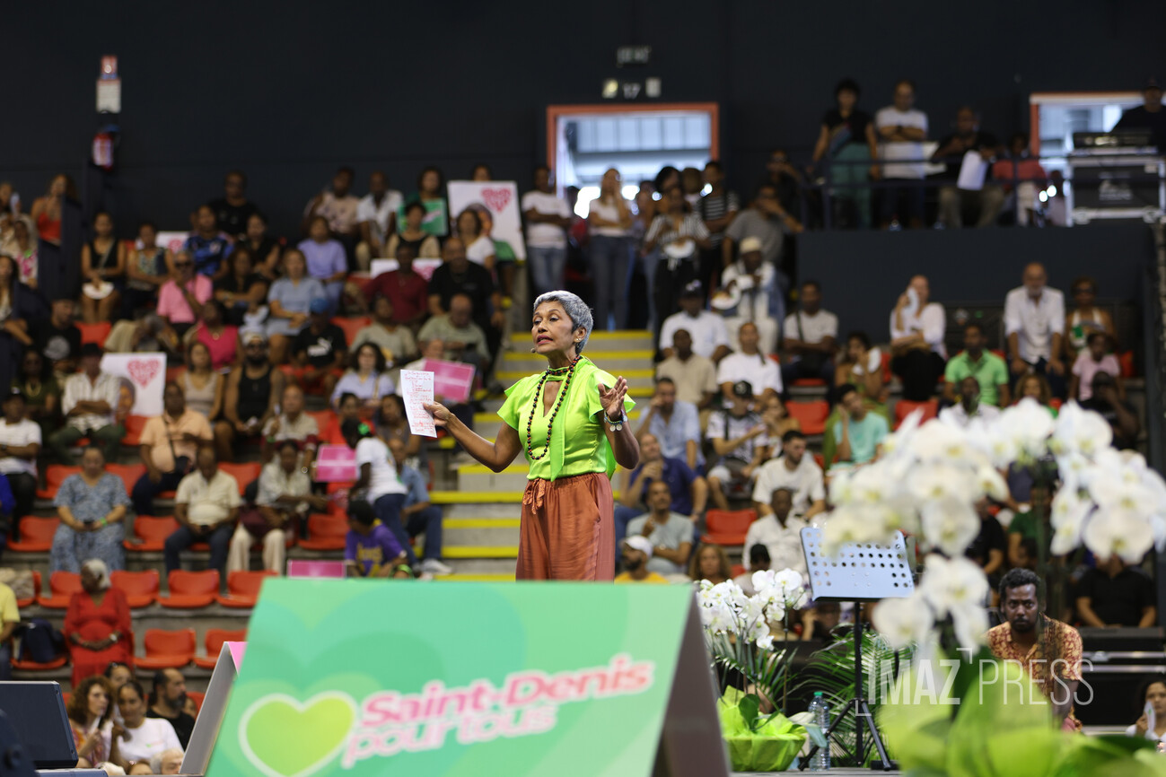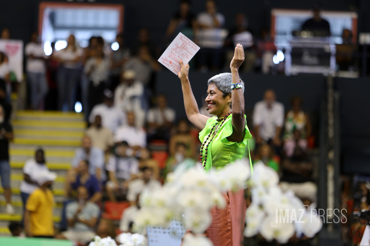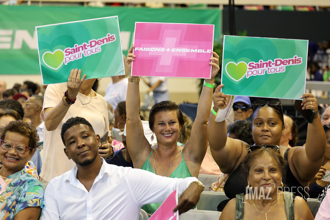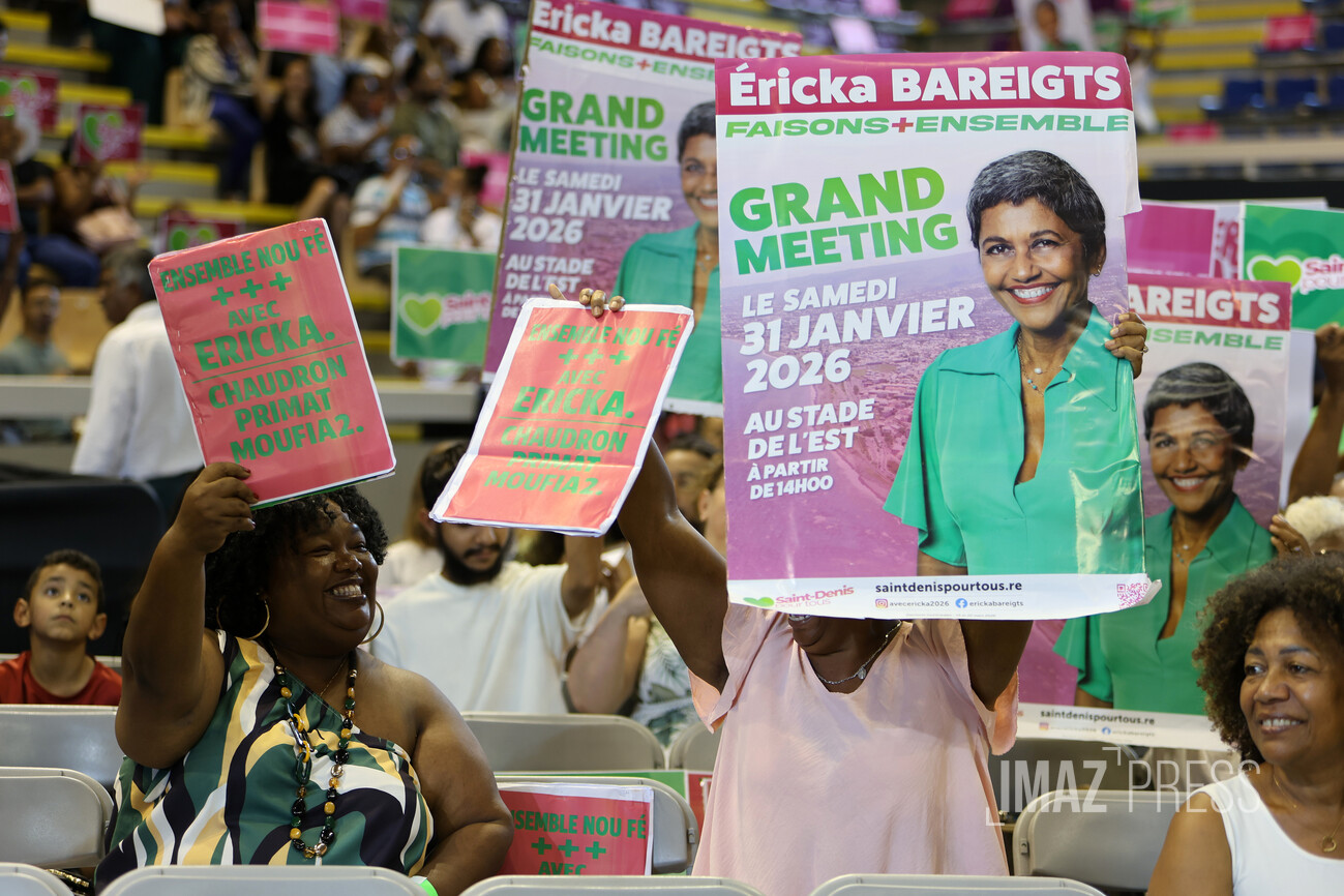 C'est au cœur du Petit Stade de l'Est à Saint-Denis, où plus de 7.000 militants se sont rassemblés, qu'Éricka Bareigts est arrivée sous les acclamations pour son meeting de campagne. Une salle, du public et surtout au milieu, un podium, hissé tel un ring. Le slogan y est affiché, "Saint-Denis pour tous". La maire de Saint-Denis avait officialisé sa candidature pour les municipales le 15 novembre 2025 sur les réseaux sociaux. Les élections municipales auront lieu le dimanche 15 mars et le dimanche 22 mars 2026 (Photos : sly/www.imazpress.com)