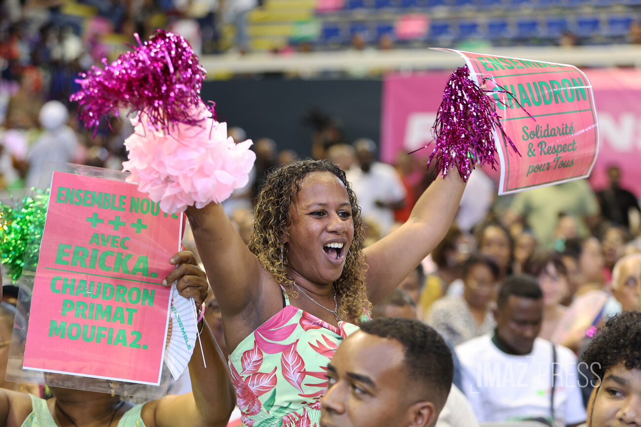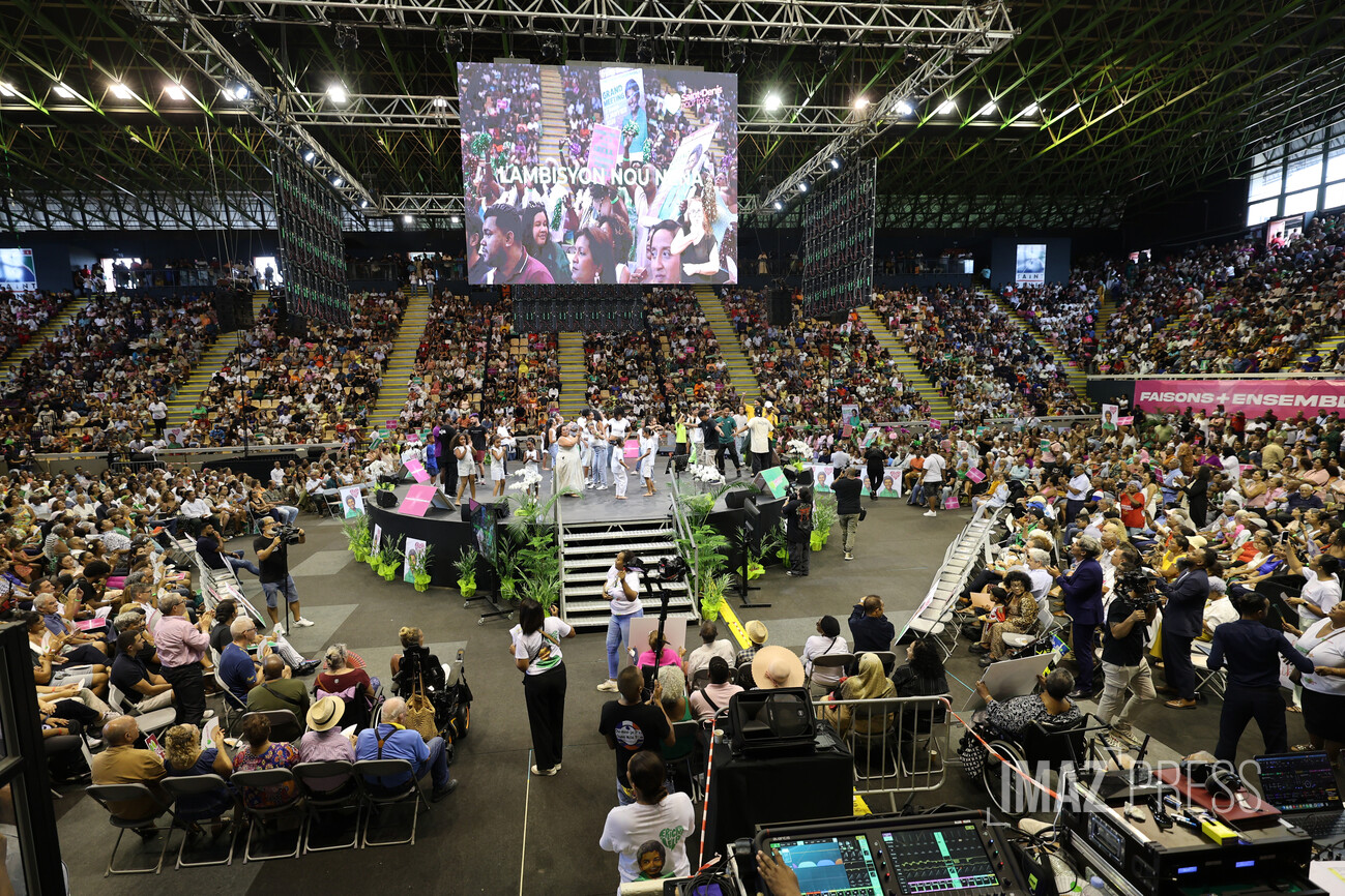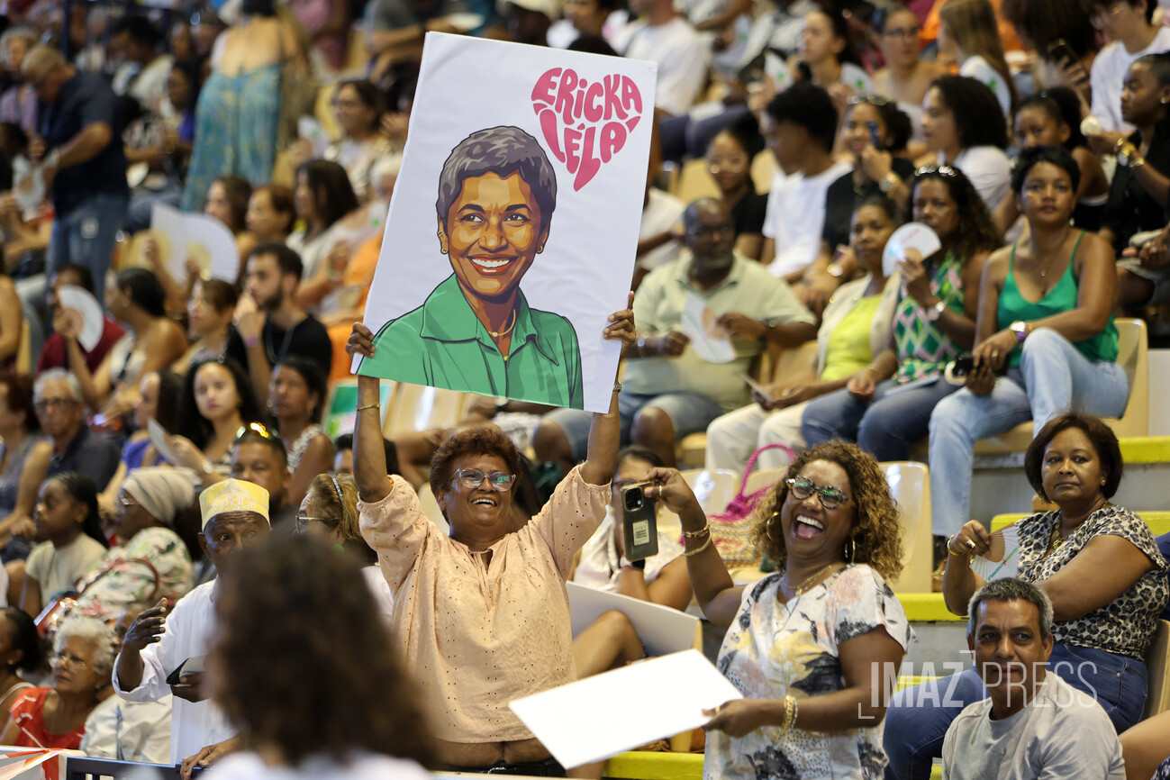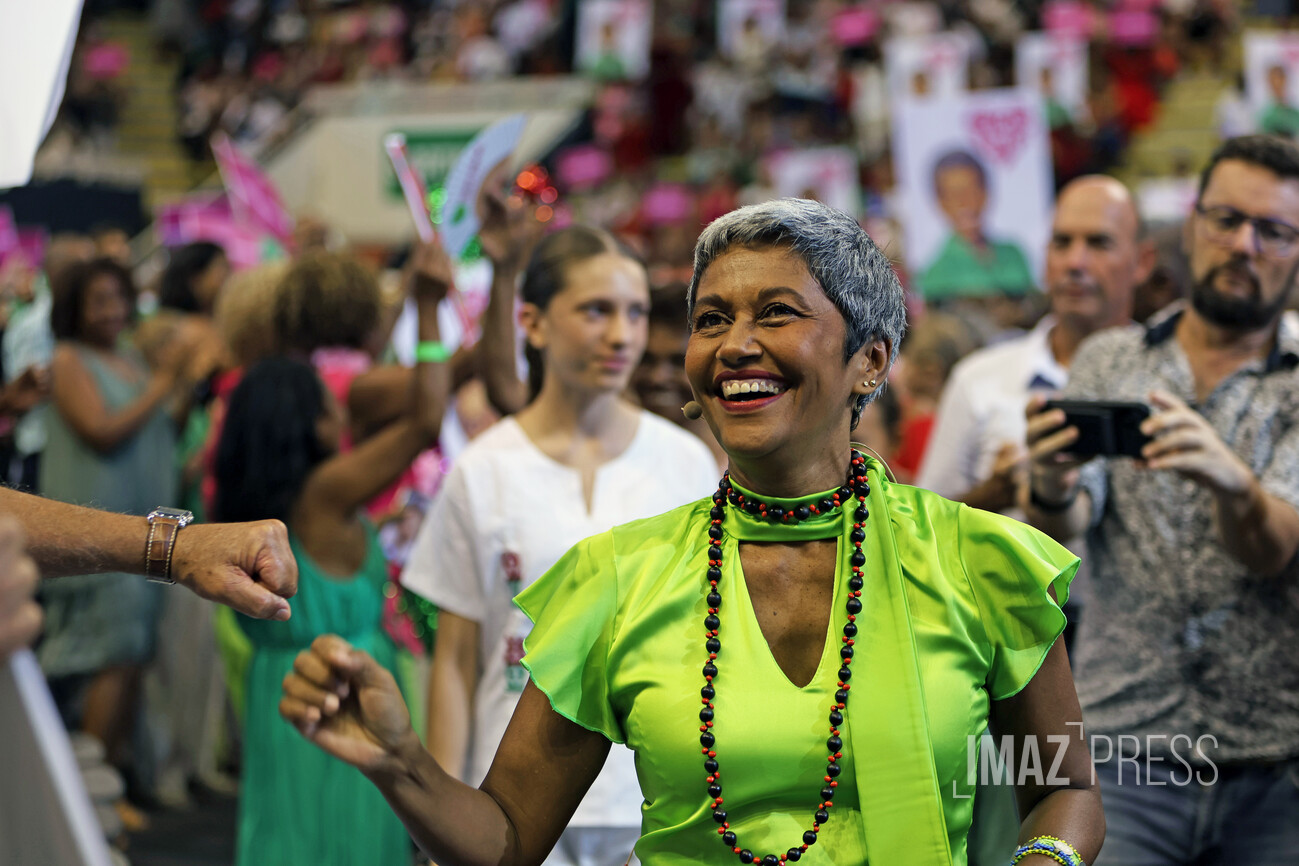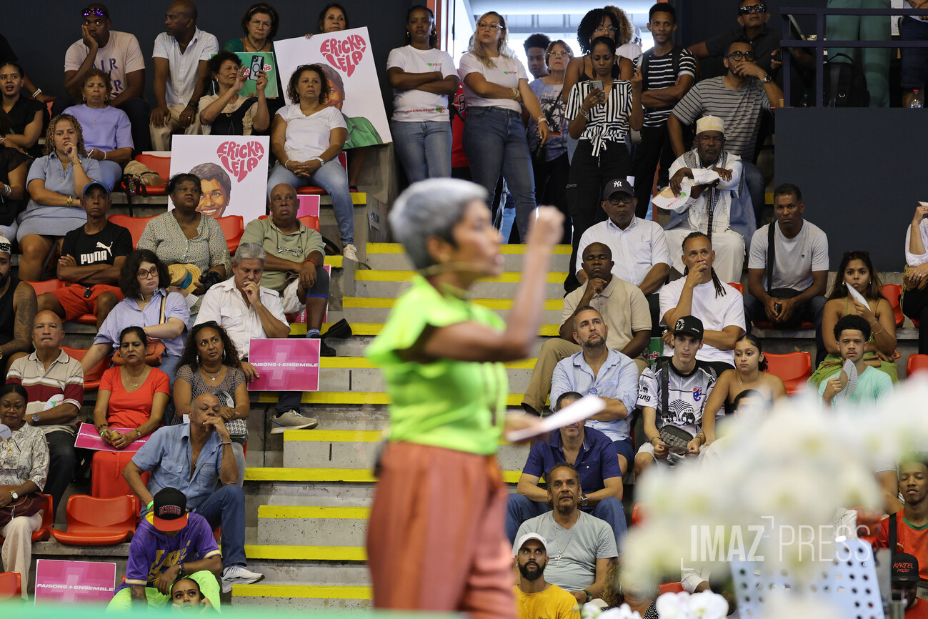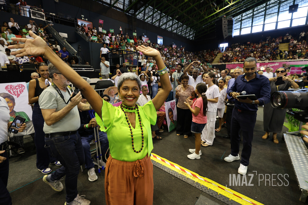 C'est au cœur du Petit Stade de l'Est à Saint-Denis, où plus de 7.000 militants se sont rassemblés, qu'Éricka Bareigts est arrivée sous les acclamations pour son meeting de campagne. Une salle, du public et surtout au milieu, un podium, hissé tel un ring. Le slogan y est affiché, "Saint-Denis pour tous". La maire de Saint-Denis avait officialisé sa candidature pour les municipales le 15 novembre 2025 sur les réseaux sociaux. Les élections municipales auront lieu le dimanche 15 mars et le dimanche 22 mars 2026 (Photos : sly/www.imazpress.com)