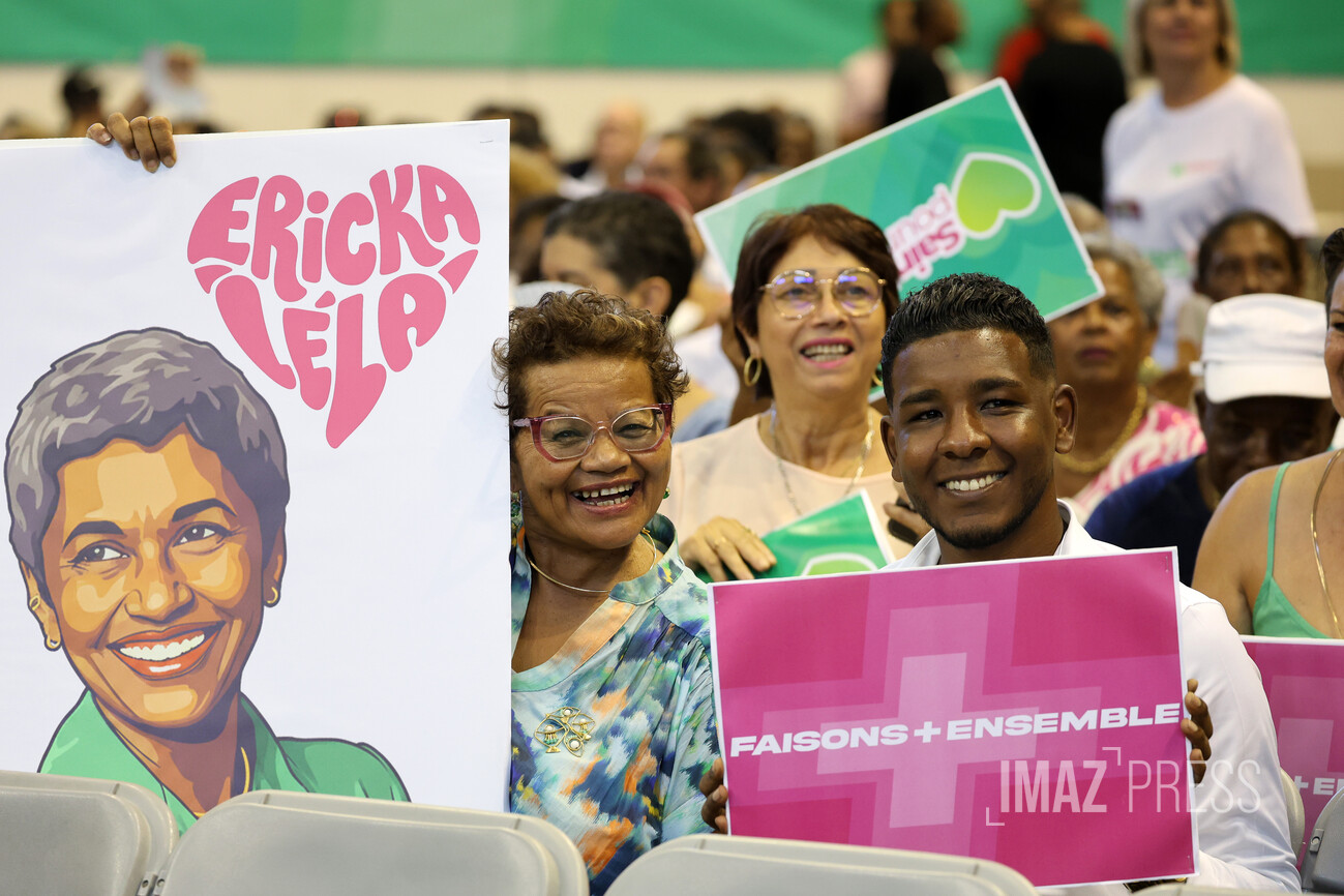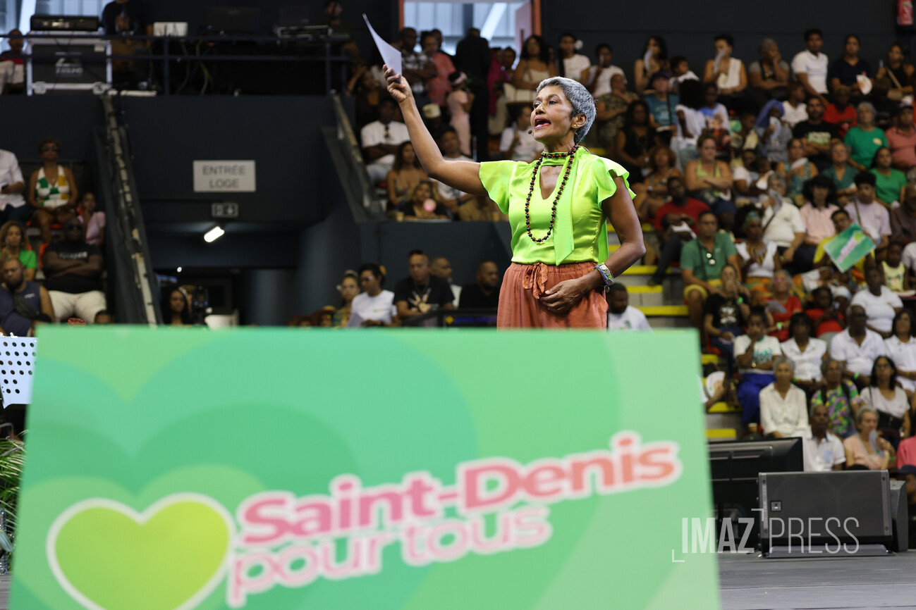 Après trente minutes d'échauffement, la maire de Saint-Denis, et candidate à sa réélection, Éricka Bareigts fait son entrée.
