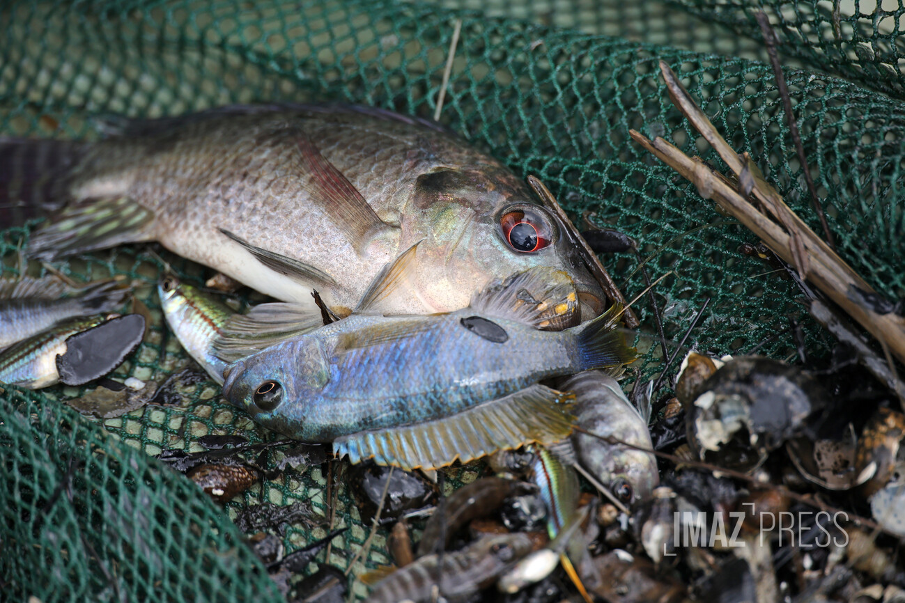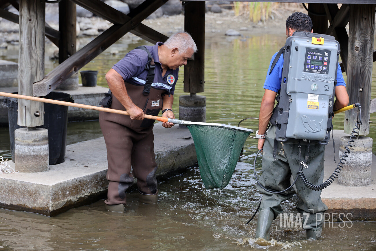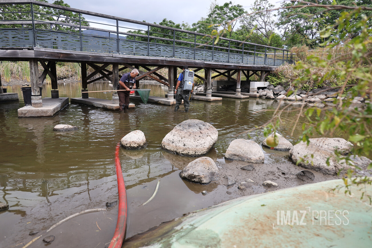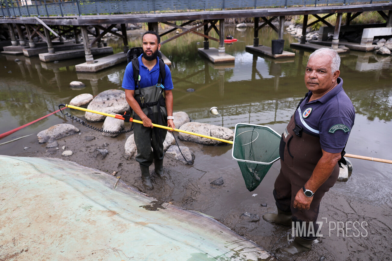 Avant le début des travaux de la passerelle qui se trouve au pied de la cascade du parc de la Trinité, les agents de la Fédération de pêche s’appliquent à vider le bassin des poissons exotiques qui se trouvent sous ce ponton. En quatre jours, plus de 200 poissons ont été repêchés. Des espèces importées, parfois envahissantes ou encore des poissons interdits à la vente depuis plusieurs années, tous relâchés dans la nature par leurs anciens propriétaires. (Photo : sly/www.imazpress.com)