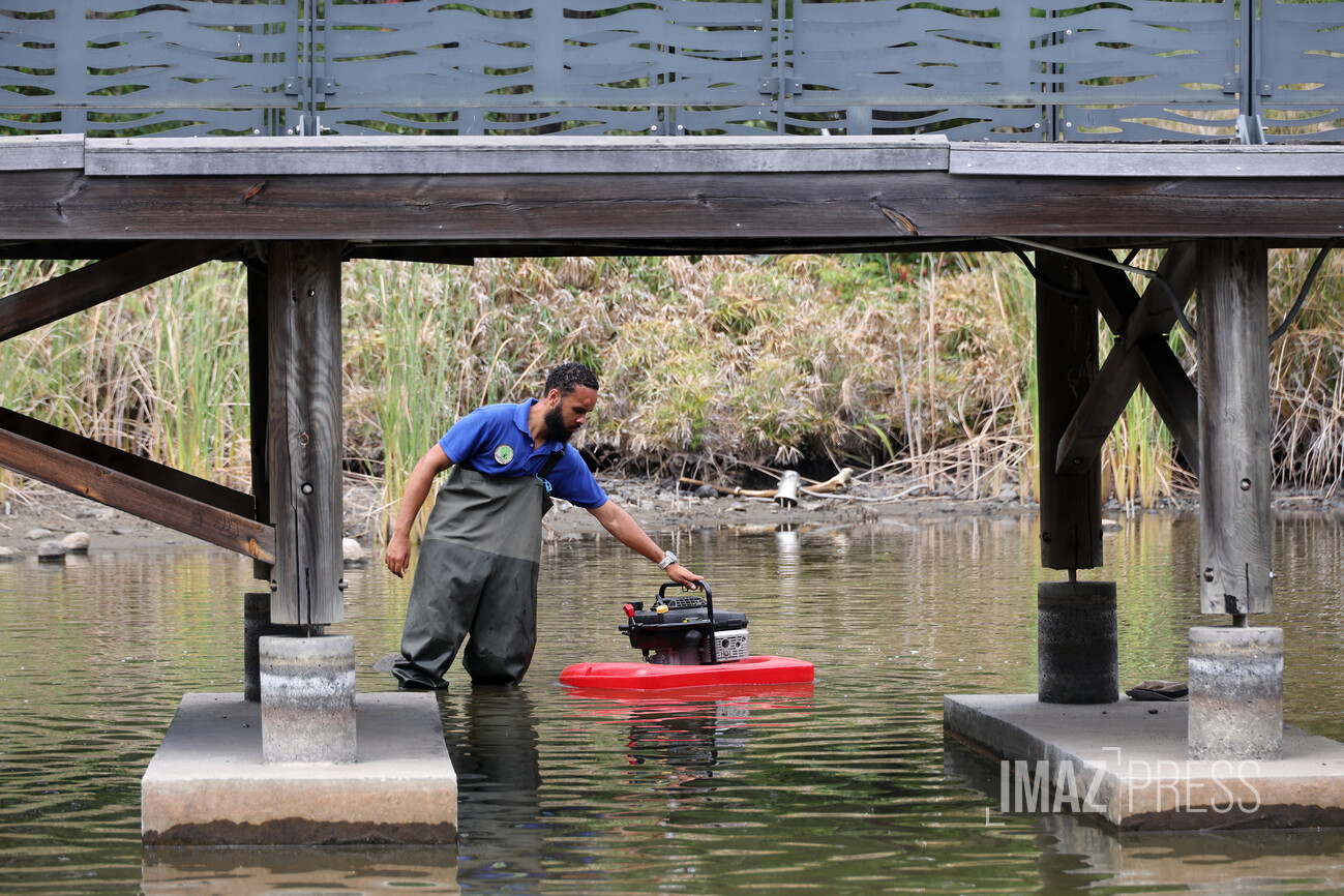Pour déménager tout ce petit monde, ils procèdent à une pêche électrique. Les gardes pêches diminuent le niveau d’eau du bassin afin de pouvoir y circuler.