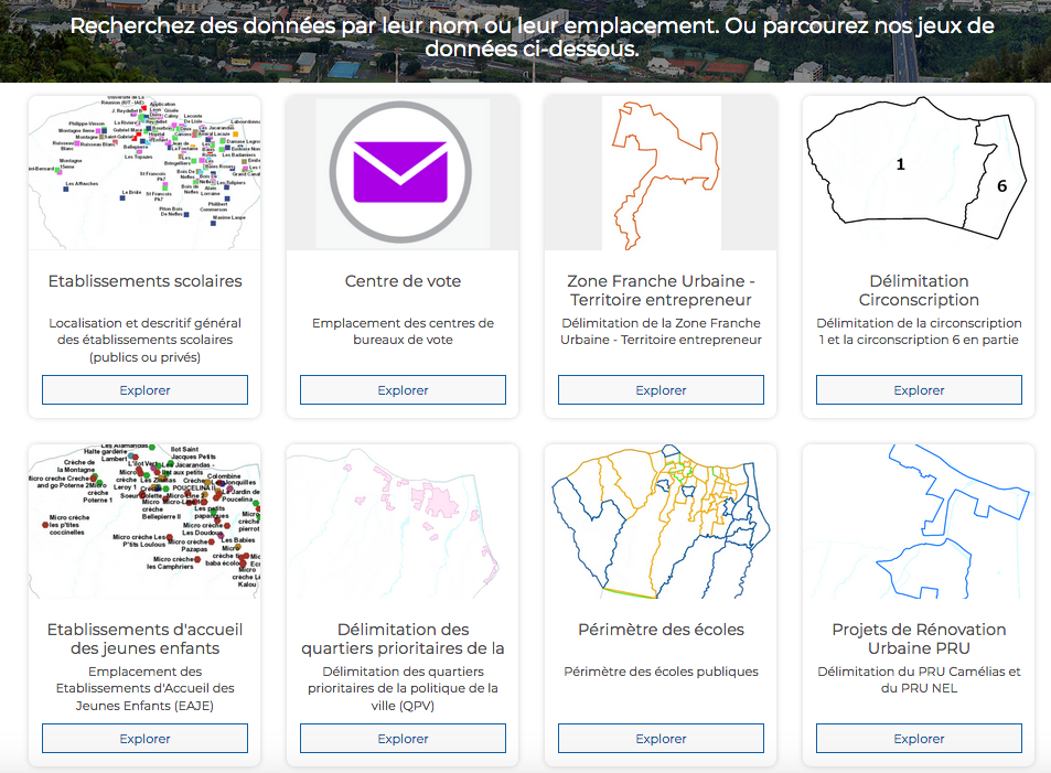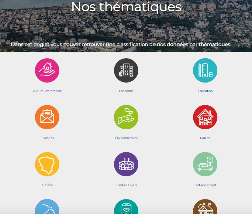 Vous pouvez par exemple découvrir les établissements scolaires, les centres de vote, la délimitation des circonscriptions ou encore les Monuments Historiques. La découverte des données par thématiques est aussi possible.