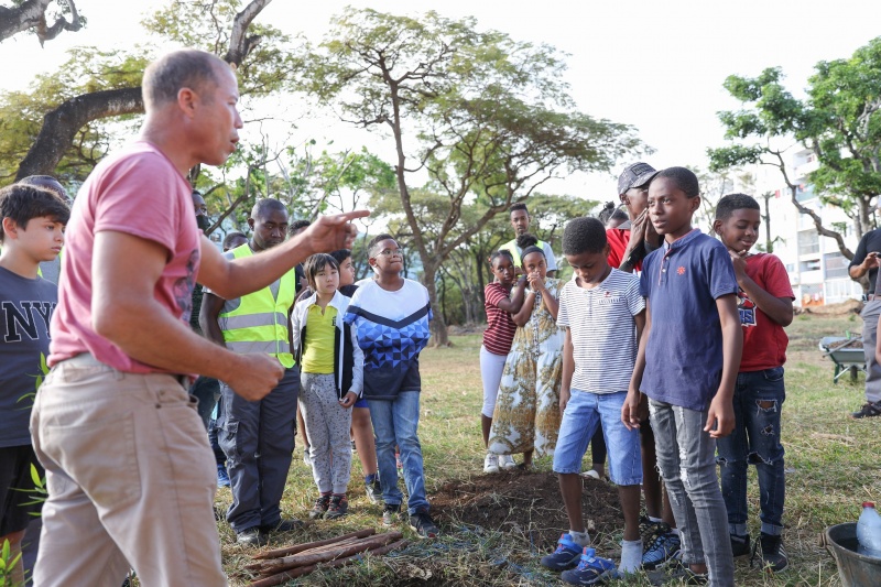 Aujourd’hui c’est sur un terrain privé et grandeur nature que les marmailles ont mis la main à la pâte. 95% des élèves habitent eux-même le quartier. Le but est de les sensibiliser à l’écologie, au développement durable ou encore au respect des choses, leur donner des valeurs de citoyenneté.