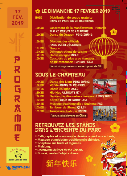 La Ville de Saint-Leu vous invite à fêter la nouvelle année du Cochon le dimanche 17 février 2019 de 8h à 18h30 dans le parc du 20 Décembre et sur le parvis de l'Hôtel de ville.Le Maire de Saint-Leu et son Conseil municipal adressent leurs meilleurs voeux à l'ensemble de la communauté chinoise. Venez assister et participer aux animations organisées par l'association Culturelle Laleu Chinoise dès 8h00 ; de la distribution de soupe jusqu'au spectacle de la troupe acrobatique chinoise Henan. (photo d'illustration rb/www.ipreunion.com)